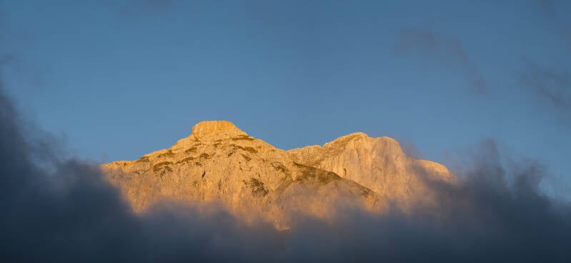 Puis, en quelques minutes, la luminosité prend le dessus. L'obscure face Ouest du Mont Aiguille fait face au géant des lieux : le Grand Veymont. On a une ample vue sur le Vercors dont les forêts amorcent leur mue automnale.