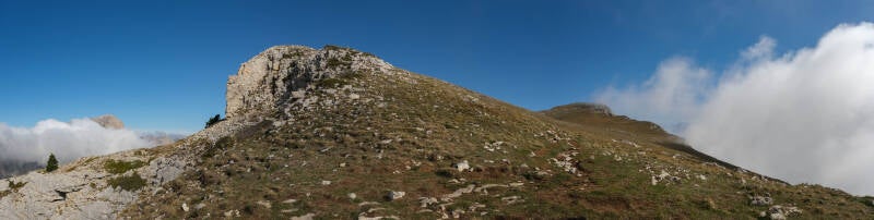 Le Petit et le Grand Veymont s'aperçoivent rapidement. Le Grand Veymont 2341m (à droite) constitue le point culminant du Massif du Vercors.
