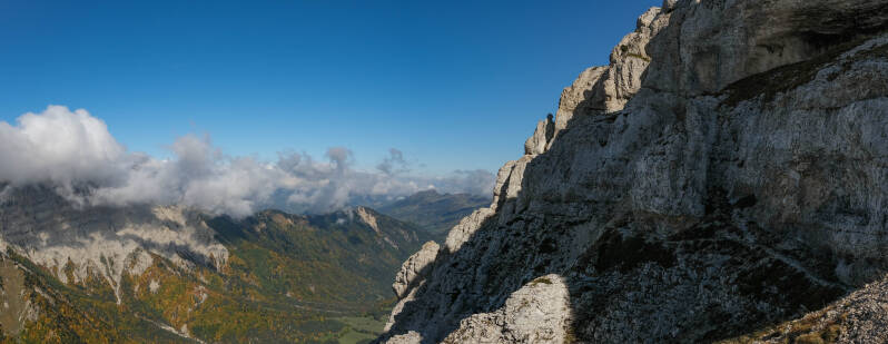 Après quelques ressauts sous l'arête, on emprunte une succession de vires (on en aperçoit une à droite) sous la plateau sommital. La vue est imprenable sur la vallée et les contreforts Est du Vercors.