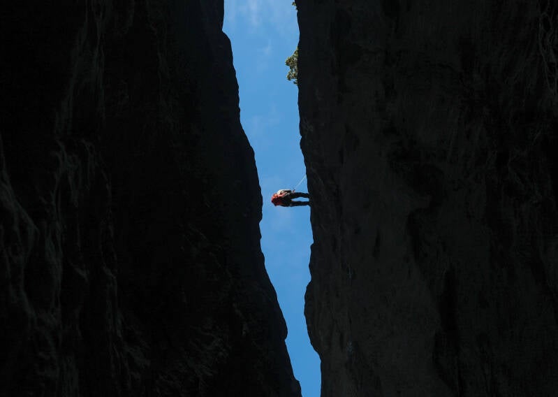 A un replat, on atteint le lieu de départ du rappel. Quelques cordées terminent leur descente puis c'est à nous de prendre le relai. C'est environ 45m de rappel qui nous attendent. D'abord on descend sur une dalle avant de plonger entre deux parois. Ce n'est que vers la fin du rappel que l'on aperçoit le sol.