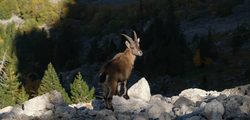 On passe aux abords de la petite arche. Au centre et sur la gauche on fait face aux Rochers du Parquets, au Pas de la Selle, au Sommet de Montaveilla et au Sommet de Peyre Rouge.