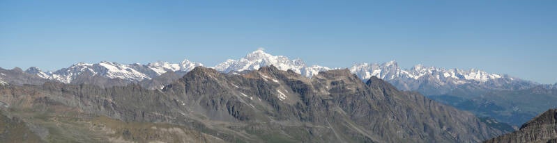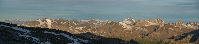 On dézoome un peu pour faire apparaitre le Nord du Massif du Mont Blanc, la Grivola (au premier plan) et les Grands Combins juste à sa droite.