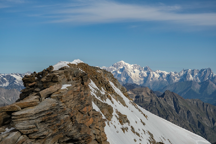 Derrière le sommet, le Mont Blanc se dresse fièrement.
