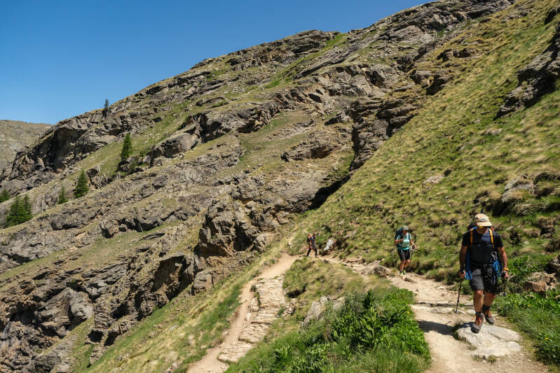 Après une courte montée dans le mélézin, le chemin pavé nous amène dans des gradins herbeux d'où nous constaterons la sécheresse qui sévit déjà dans les alpages. Puis, au fil des lacets un premier sommet enneigé apparait. Il ne s'agit pas du Grand Paradis mais du Ciarforon 3640m.
