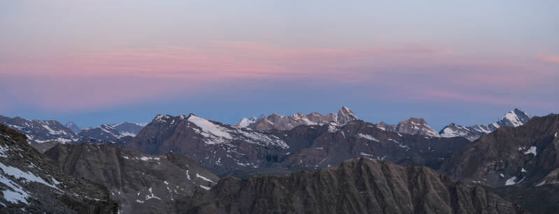 Le jour commence à se lever au-dessus des Alpes grées et du Massif du Grand Paradis. Quelques sommets de la Vanoise apparaissent en toile de fond comme la Dent Parrachée, la Pointe de la Sana, la Grande Motte ou encore la Grande Casse. Quelques cirrus s'illuminent de rose au-dessus des Alpes françaises.