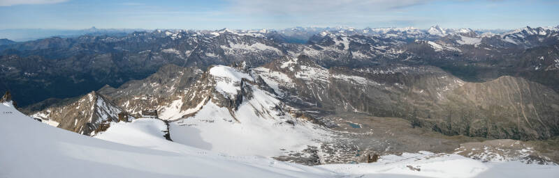 Le Grand Paradis se situe au niveau de la courbe de l'arc alpin, ce qui explique ce panorama grandiose, notamment au Sud, à l'Ouest et au Nord. Sans oublier la Plaine du Pô et la ville de Turin qui sont également visibles depuis le géant valdôtain, encore faut-il que la visibilité et la pollution ne les occultent pas.