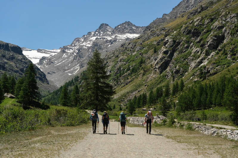 La première partie de l'ascension se fait en randonnée pour rejoindre le Rifugio Vittorio Emanuele II perché à 2732m. Cette première journée est simple puisque seulement 750m de dénivelés positifs séparent le point de départ, le petit hameau du Pont, du refuge italien.