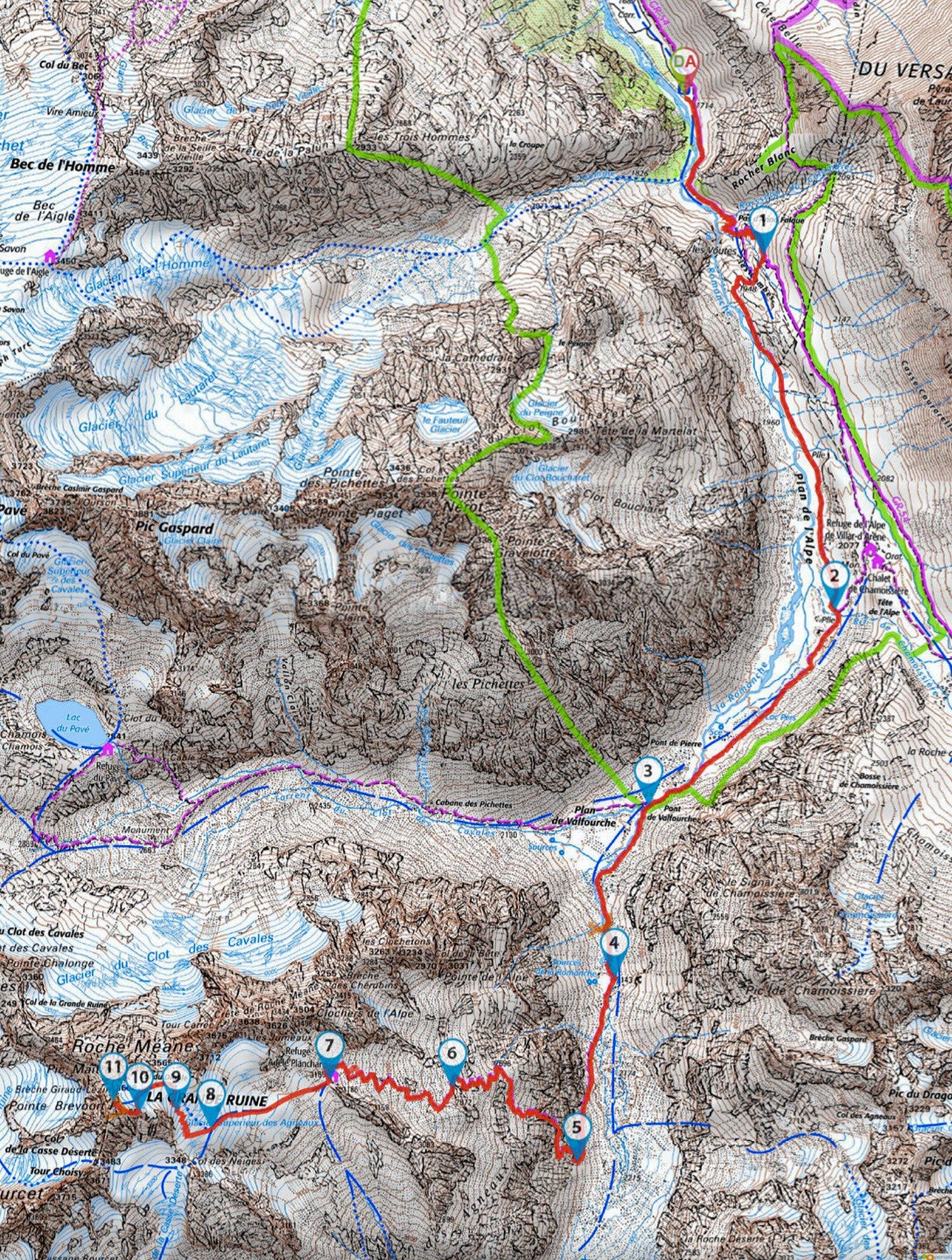 C'est donc avec le feu vert du guide le vendredi 25 juin 2021 que nous nous préparons pour ce week end au coeur du Parc National des Ecrins. Cette ascension s'effectue sur deux jours : une première journée de randonnée qui nous permet de grimper jusqu'au refuge où nous serons rejoint par le guide en fin d'après midi, puis une seconde journée dont le point d'orgue sera la montée jusqu'au sommet de la Grande Ruine suivie par la descente, non pas jusqu'au refuge, mais jusqu'au point de départ de la veille.