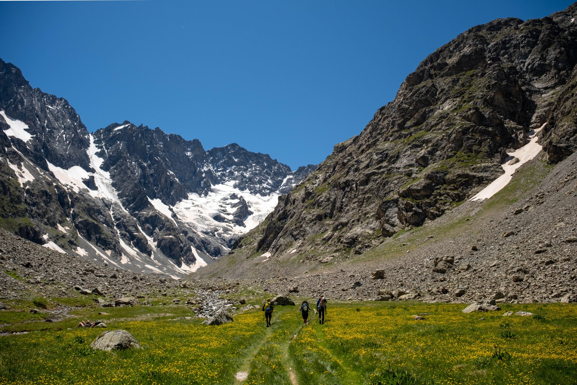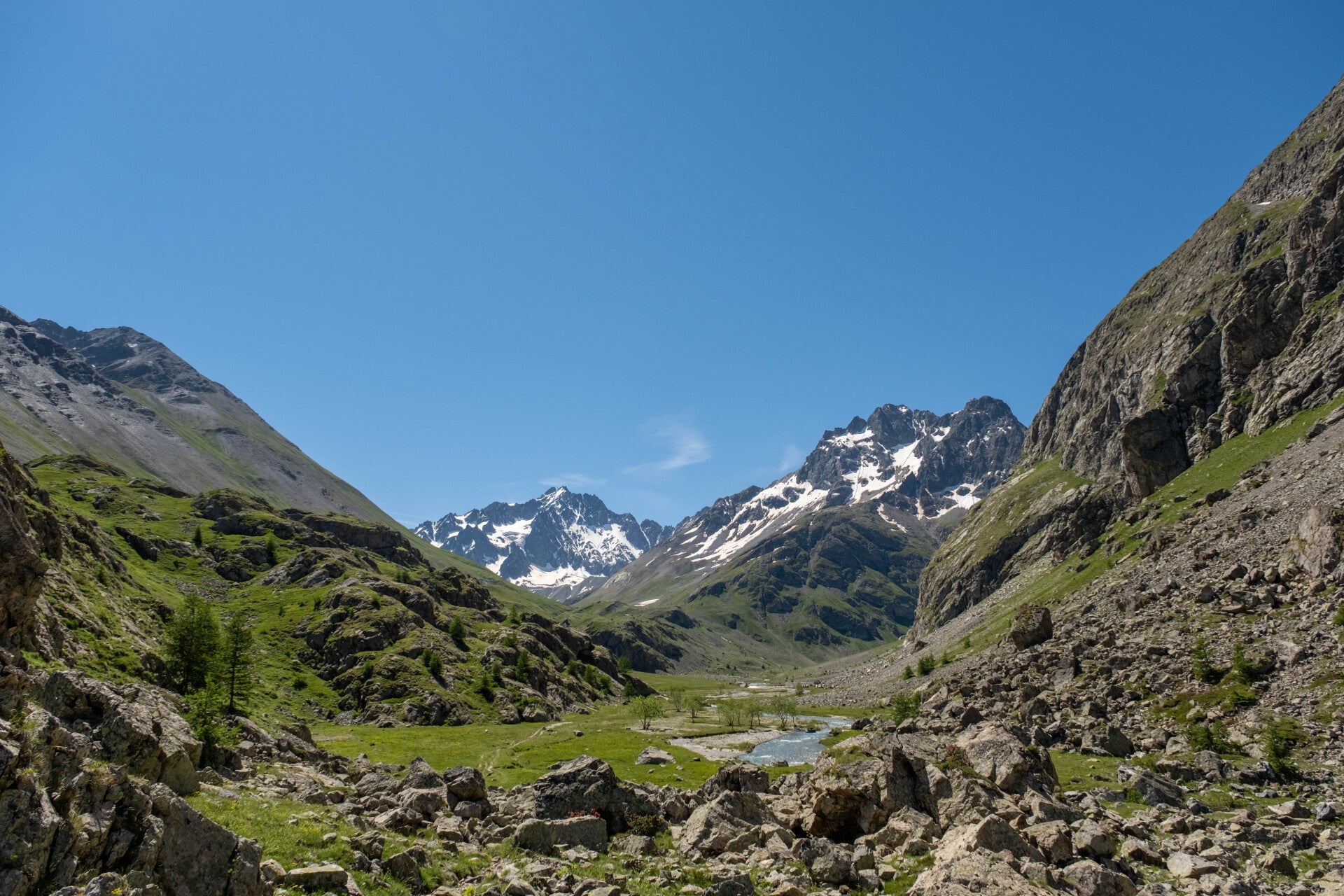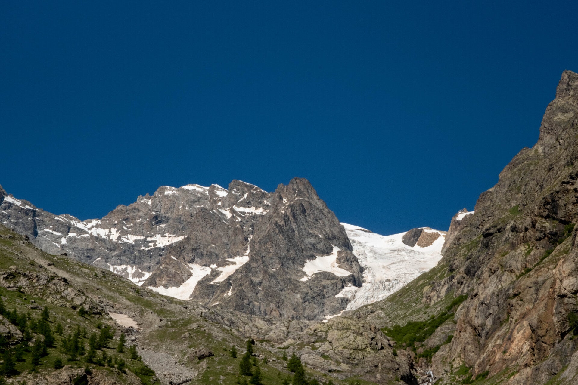 Dès notre départ, les neiges éternelles et les glaciers nous surplombent. Les fonds de vallées sont totalement verts, contrastant avec les hautes cimes des Ecrins.