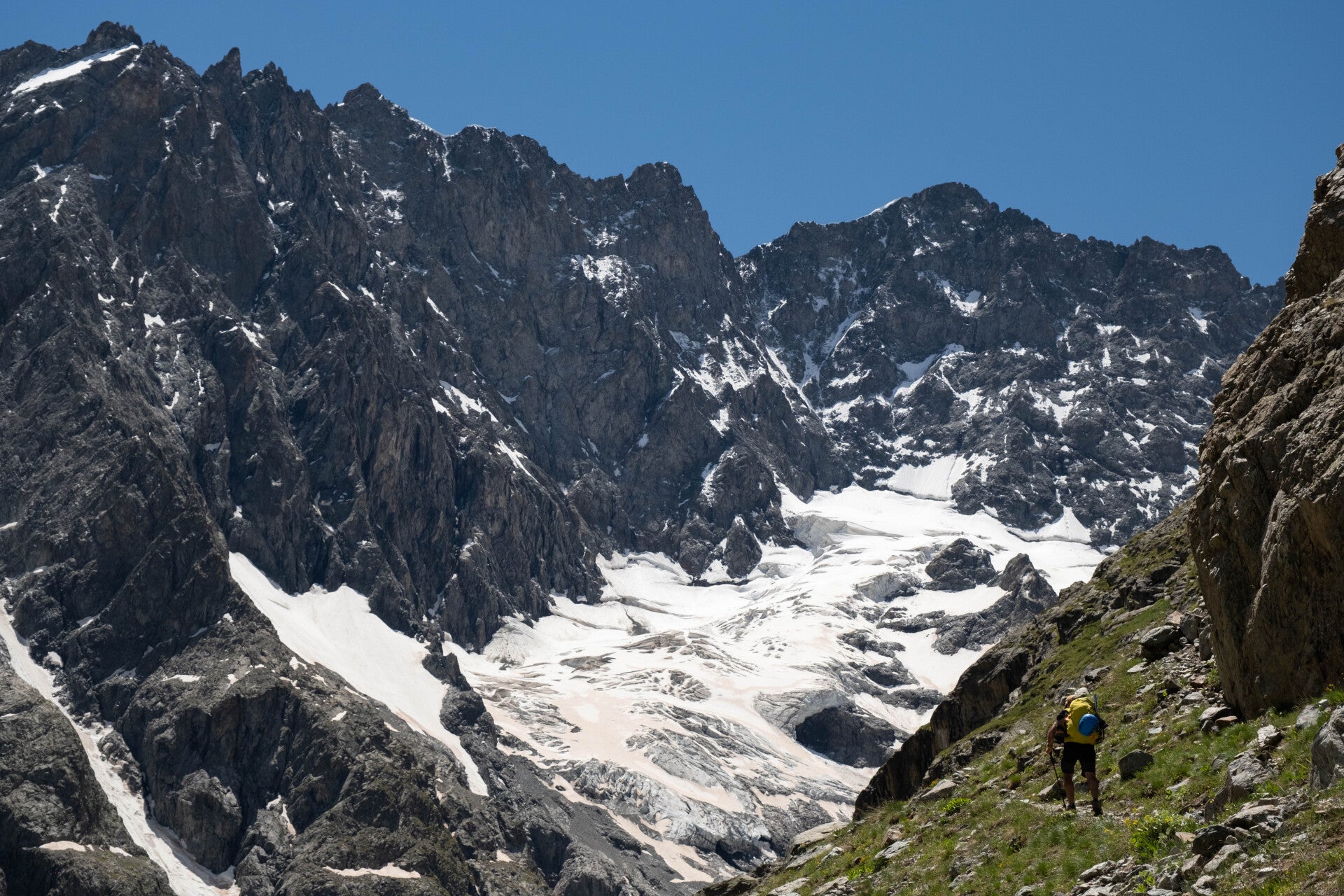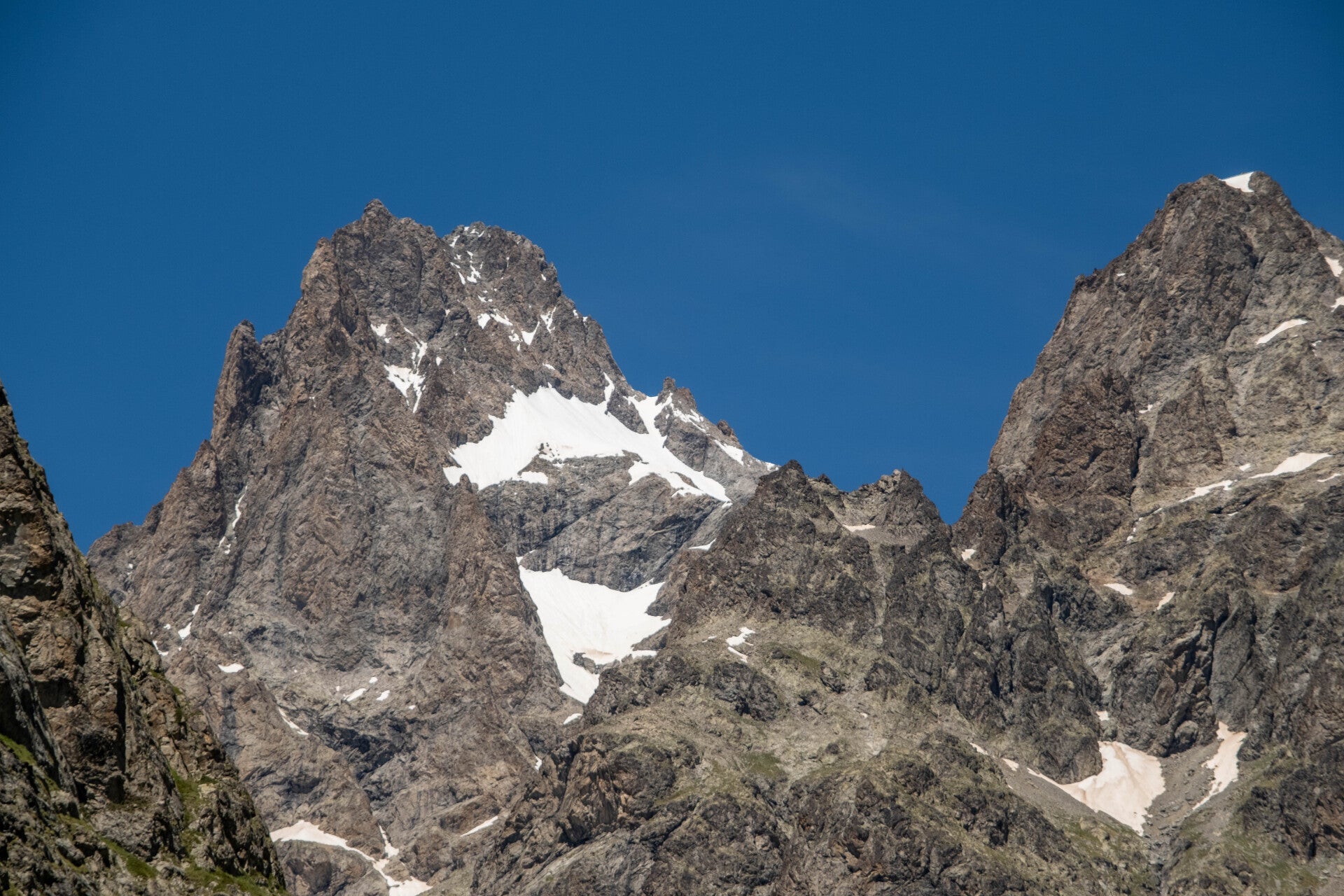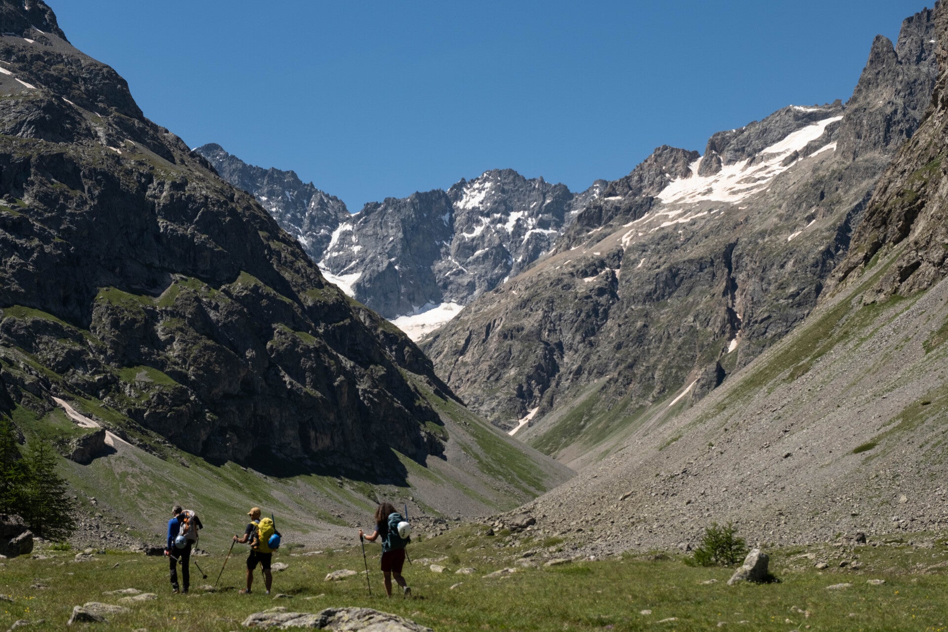 Dès notre départ, les neiges éternelles et les glaciers nous surplombent. Les fonds de vallées sont totalement verts, contrastant avec les hautes cimes des Ecrins.