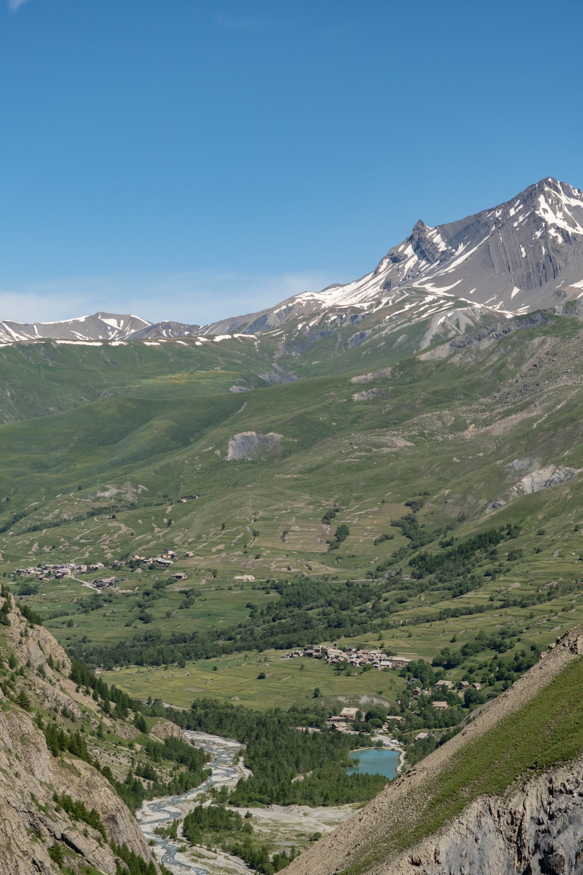 Derrière nous, le départ de la randonnée se situe au niveau du lac turquoise. L'Aiguille du Goléon 3427m surplombe les petits hameaux de la haute vallée de la Romanche.