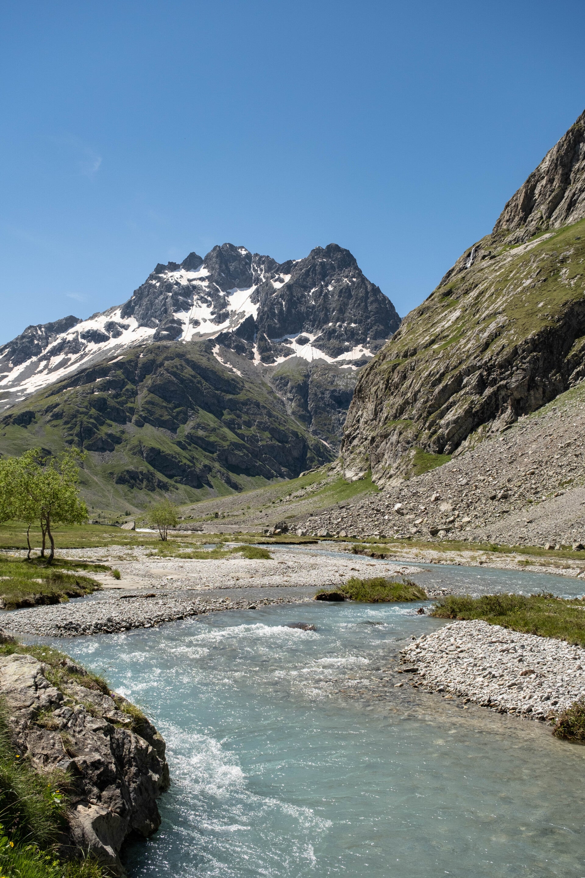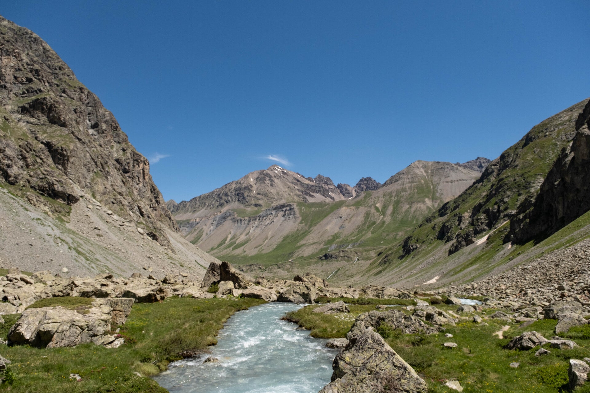 Dans cette vallée, la Romanche a une couleur resplendissante due aux sédiments des glaciers qui alimentent cette rivière. Sur la gauche, le Glacier de Tombe Murée sous la Roche Faurio 3750m.