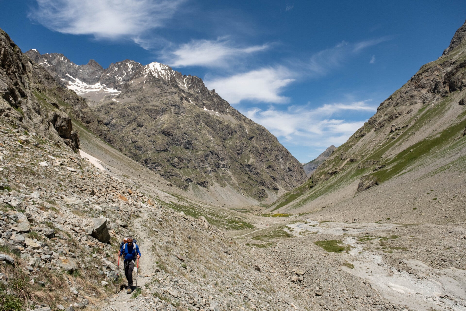 Une partie de la Grande Ruine s'impose au fond de la vallée avec ses immenses pics rocheux. En réalité, la Grande Ruine est un ensemble de pointes avec comme point culminant la Pointe Brevoort 3765m (notre objectif du lendemain). Ce sommet n'est d'ailleurs pas visible depuis le fond de cette vallée. Au pied de la Grande Ruine, la vallée se découpe une nouvelle fois en deux, à gauche on se dirige vers les sources de la Romanche, et à droite on peut tenter l'ascension du Lac du Pavé. Nous emprunterons brièvement la vallée menant aux sources de la Romanche avant de partir dans la pente, à l'assaut du refuge.