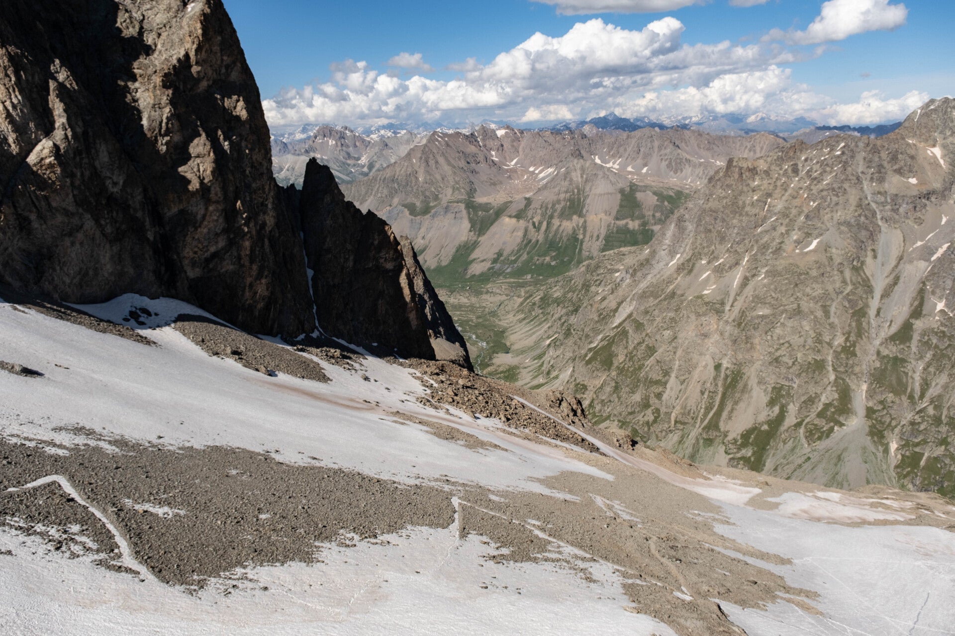 Les sensations sont au rendez-vous. En dessous de nous, plusieurs dizaines de mètres de vide qui se terminent dans un mélange de roche et de glace. La luminosité est exceptionnelle avec la Barre des Ecrins qui guette chacun de nos pas.