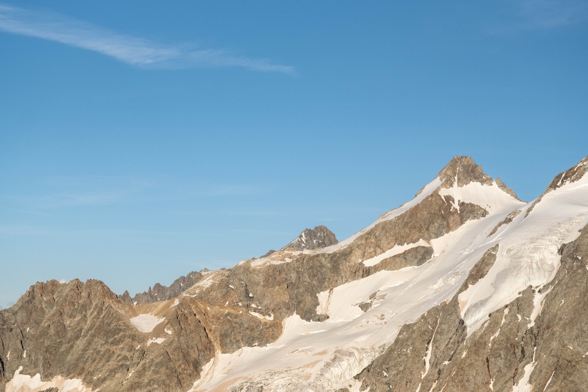 En zoomant un peu sur le Glacier du Lautaret, on peut apercevoir sur la droite du glacier le Refuge de l'Aigle (cube gris) perché sur son éperon rocheux. Ce refuge posé à plus de 3400m est le camp de base pour l'ascension d'un autre sommet mythique des Ecrins : la Meije 3983m.