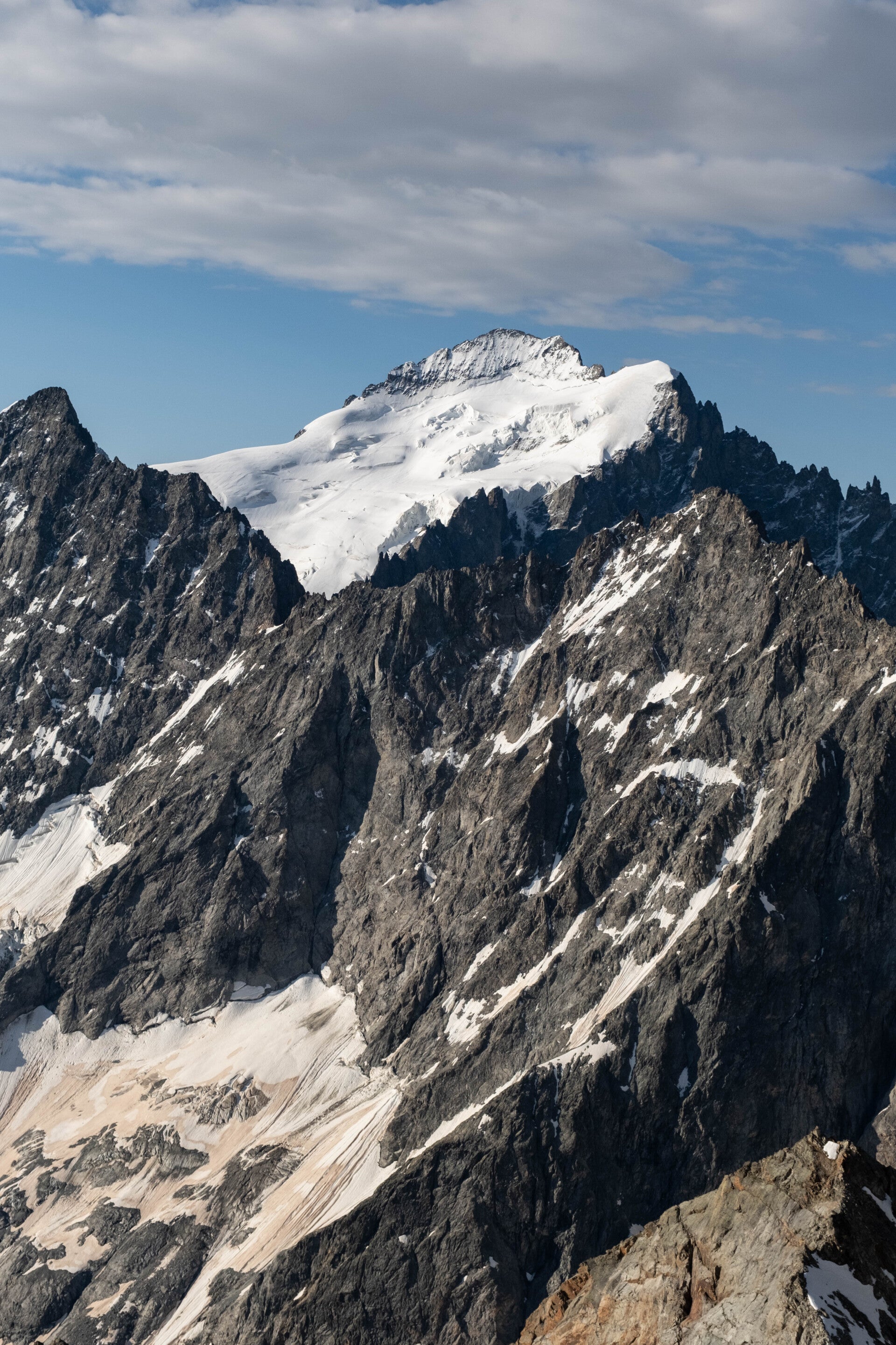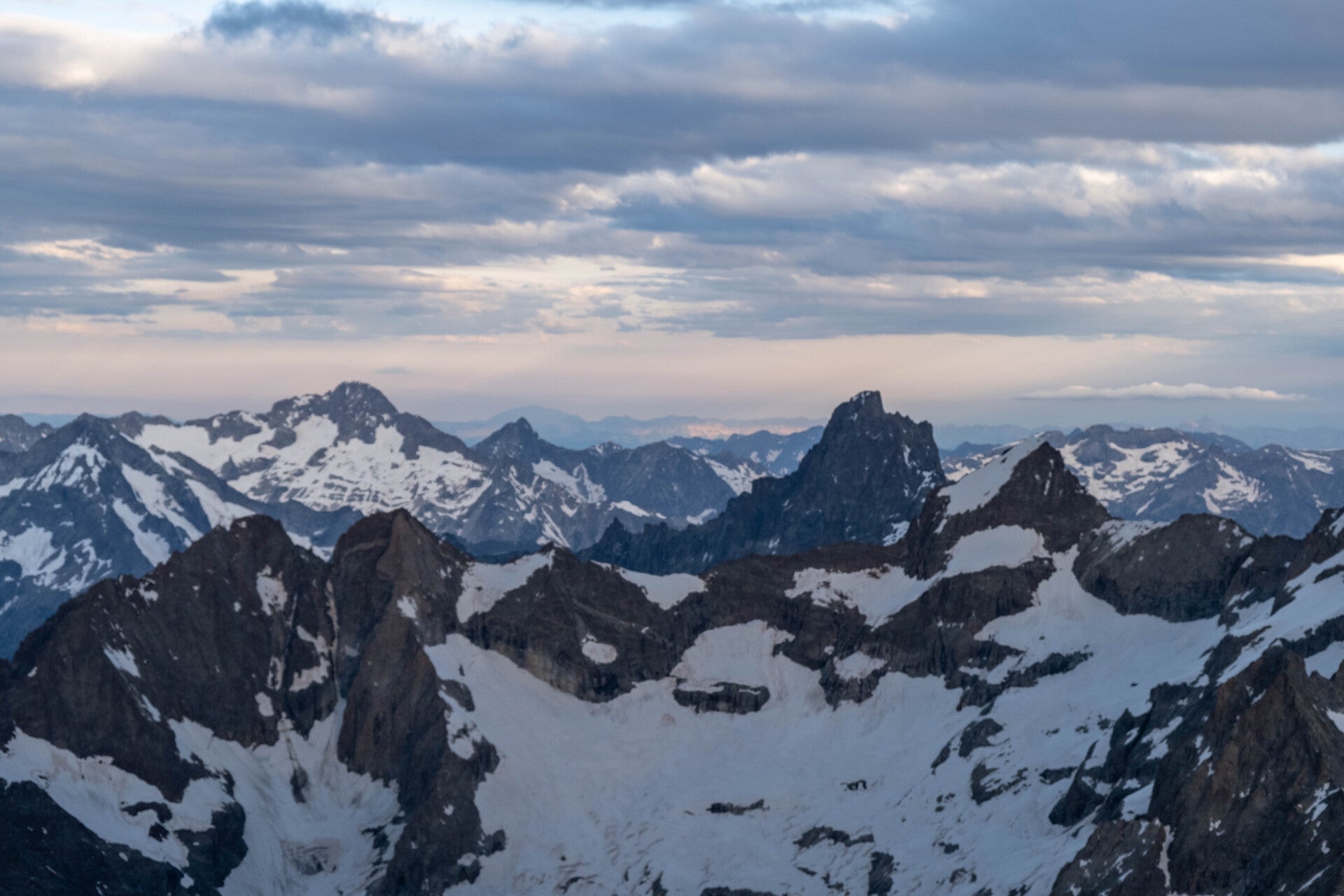 Le temps que nous profitons de la vue au sommet de la Pointe Brevoort, le guide nous fait un tour d'horizon des sommets visibles depuis ce panorama : Mont-Blanc, Aravis, Grandes-Rousses, Vercors, Taillefer, Dévoluy, l'Olan, Sirac, Bans, Ailefroide, Barre des Ecrins, Pelvoux, Montagne des Agneaux, Escreins, Mont Viso, Queyras, Cerces, Vanoise, Grand Paradis, Cervin, Meije, Râteau etc... C'est un panorama à 360° qui s'offre à nous et que les nuages élevés n'arriveront pas à nous cacher.