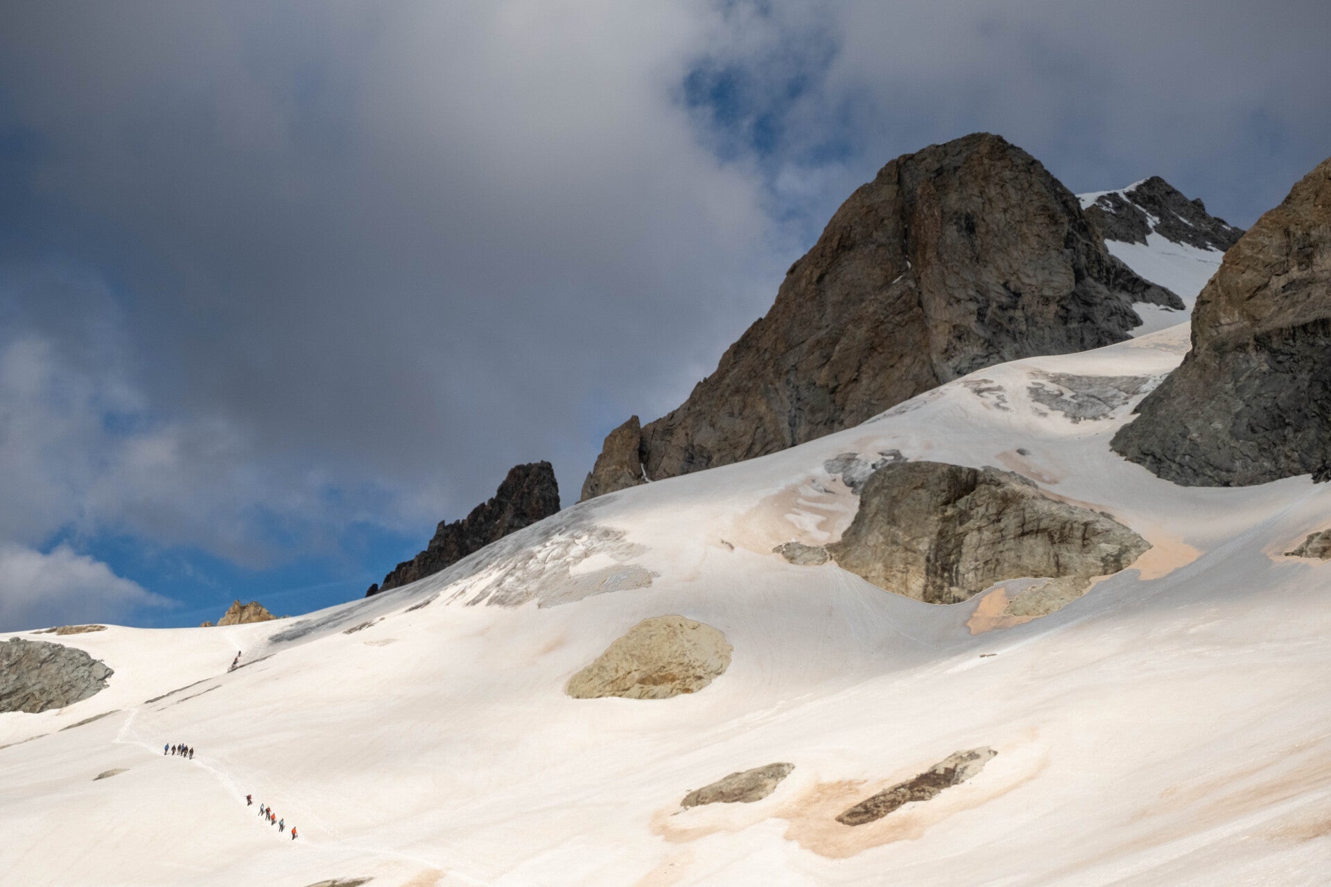 L'herbe perd peu à peu du terrain face à la roche et à la glace. Au centre, on observe le Col de la Roche Faurio.