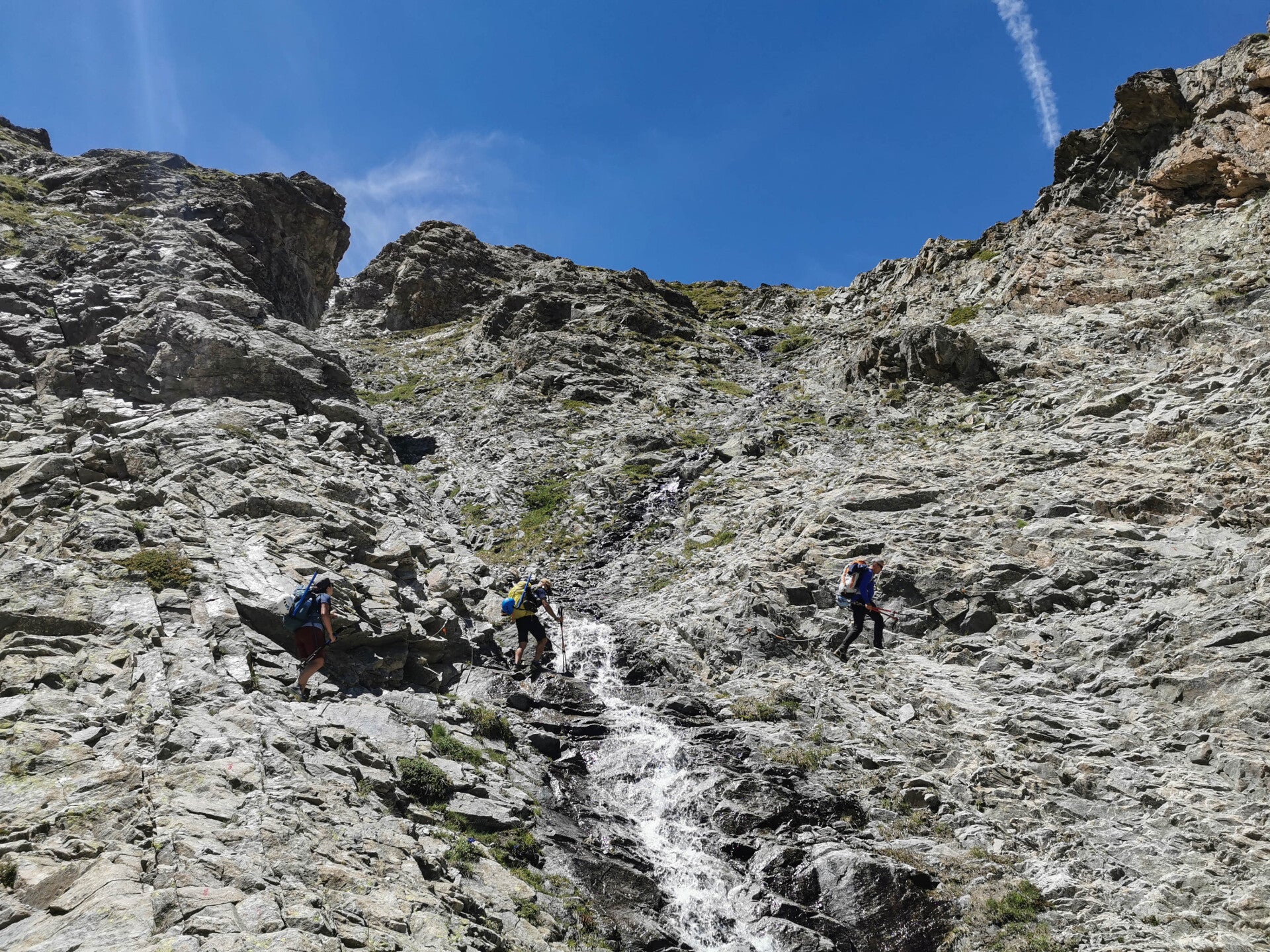 Quelques centaines de mètres en direction des sources de la Romanche nous emmènent au pied de la paroi rocheuse à droite, où se situe le raide sentier menant au refuge.