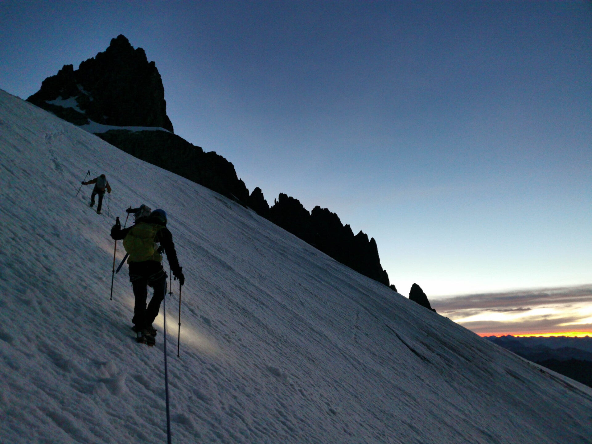 Le réveil fut compliqué. Dehors, la nuit bat son plein. Seule la Lune éclaire légèrement les montagnes des environs. Au moins, la nuit a été claire ce qui a permis le regel. Après avoir englouti rapidement notre petit déjeuner, il faut maintenant s'équiper pour qu'ensuite le guide nous encorde. Quelques cordées démarrent l'ascension, nous serons les troisièmes à partir à l'assaut de la Grande Ruine. A 4h15, nos crampons frôlent la neige pour la première fois. C'est le début d'une ascension dans une ambiance mémorable : pas de vent, un clair de Lune illuminant légèrement le Massif des Ecrins, une succession de cordées arpentant la montagne et l'éclairant avec leur frontale. Puis, peu à peu, c'est le dégradé qui se prépare à l'Est. Les couleurs chaudes apparaissent : rouge, orange, jaune. C'est ensuite les couleurs froides qui succèdent et occupent encore la majeure partie du ciel alpin.