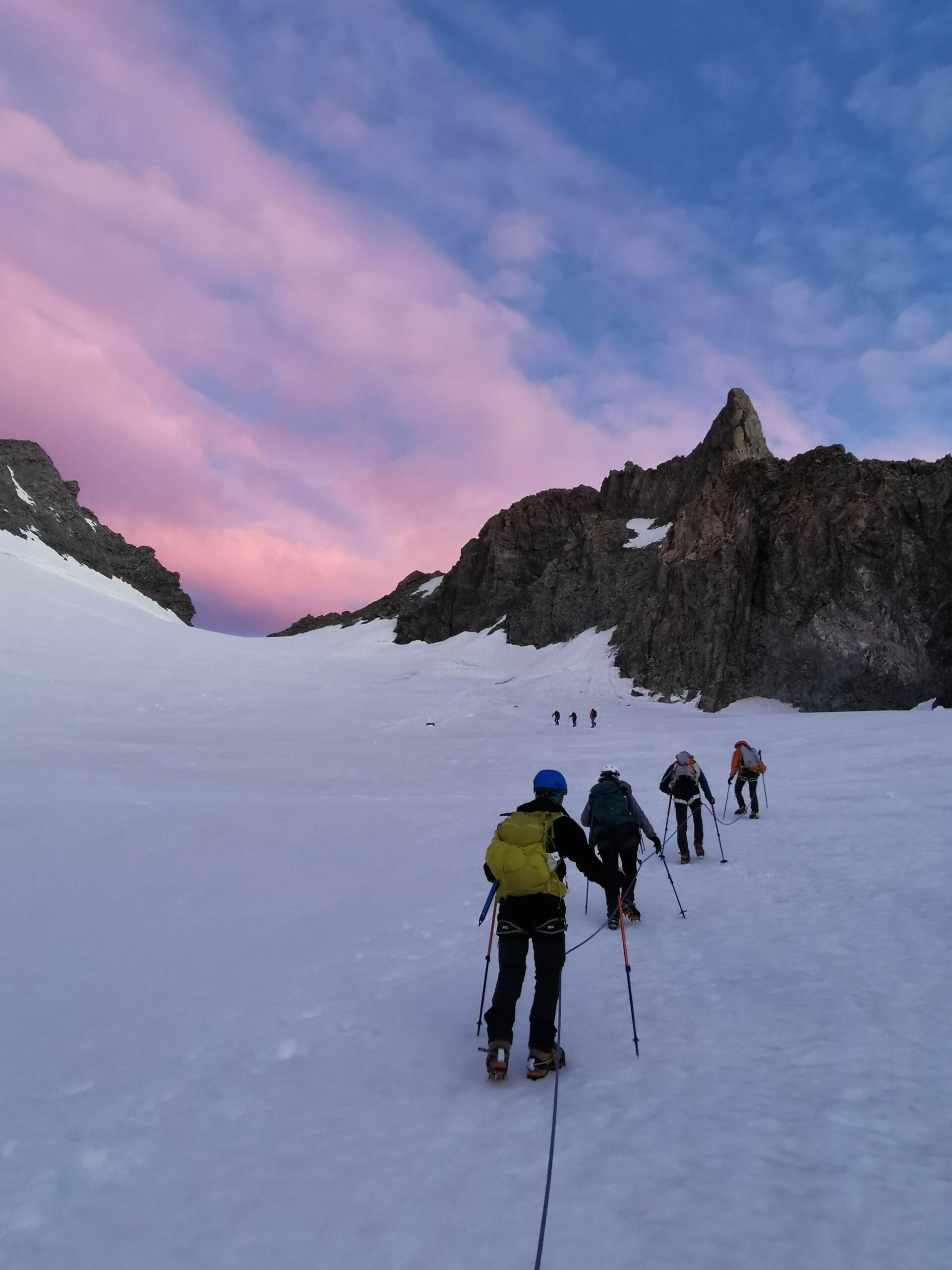 L'espace entre les cordées étant assez important, le guide nous propose une pause pour boire, prendre quelques photos, réduire la taille d'encordement entre chaque membre, nous délester de nos bâtons qui ne nous serviront plus pour la suite de l'ascension et enfin, enfiler nos lunettes de soleil puisque les premiers rayons ne sauraient tarder.