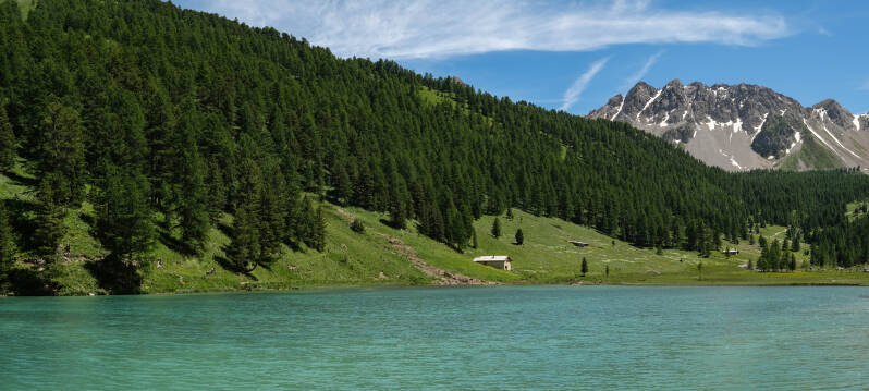 On plonge directement sur le lac. Encore une fois, sans sentier. Malgré l'absence de soleil, le lac se pare de vert à l'instar des alpages et des mélèzes qui l'entourent.