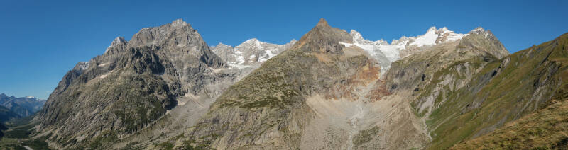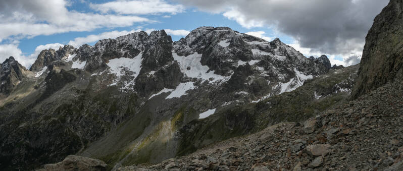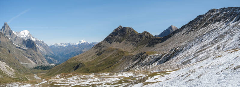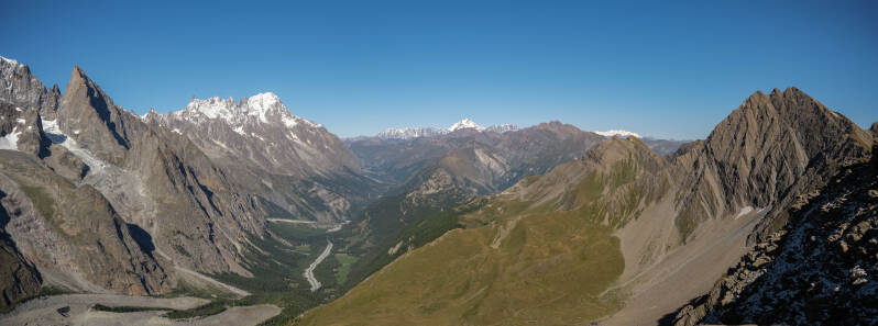 On s'écarte rapidement des foules de randonneurs amassées au Col de la Seigne pour pleinement profiter du paysage. Le chainon du Massif du Mont Blanc file vers le Nord. On démarre avec l'Aiguille des Glaciers suivie de l'Aiguille de Tré la Tête, du Mont Blanc, du Mont Blanc de Courmayeur, de l'Aiguille Blanche de Peuterey, de l'Aiguille Noire de Peuterey pour finir avec les Grandes Jorasses. Tout au fond à droite, on devine les Grands Combins.