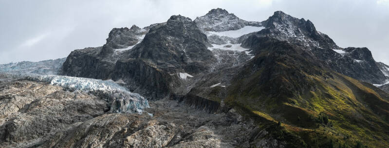 Au Rifugio Elena 2062m, on fait face à la langue glaciaire du Glacier de Pré de Bard et au Mont Dolent 3823m. Sa fonte et son recul laissent apparaitre un austère cirque rocheux gris et rougeâtre.