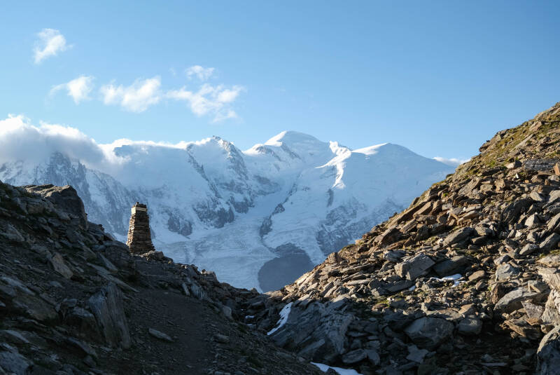 Un peu avant le col, le Mont Blanc 4805m refait une apparition flamboyante. Dans le prolongement de son arête à droite, on devine le Mont Maudit puis le Mont Blanc du Tacul.
