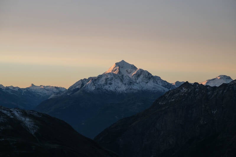 Premières lueurs près des géants de Savoie : Aiguille de la Grande Sassière, Albaron, Mont Pourri, Grande Motte et Grande Casse.