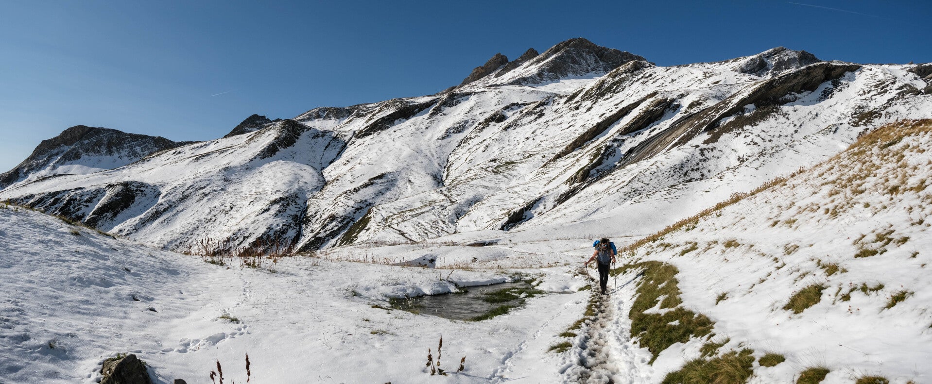 Même au mois de septembre, la Tour du Mont Blanc est encore arpenté par de nombreux randonneurs. Le Refuge du Col de la Croix du Bonhomme affichait d'ailleurs complet le soir où nous y avons dormi. Ce qui fait aussi que malgré la neige, la trace est bien faite, que ce soit sur l'itinéraire classique ou certaines variantes du TMB.
