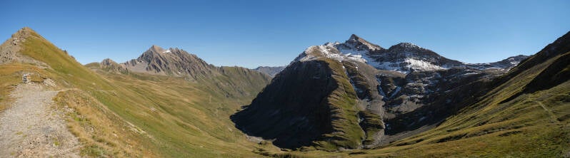 Une fois au Col de Chavannes 2603m, on pénètre dans le Massif des Alpes Grées. Les sommets sont d'altitude moindre que ceux du Massif du Mont Blanc, mais les paysages n'en perdent pas moins leur superbe. On domine ainsi le Vallon de Chavannes avec à gauche le Monte Berio Blanc 3252m et à droite le Monte Ouille 3099m.