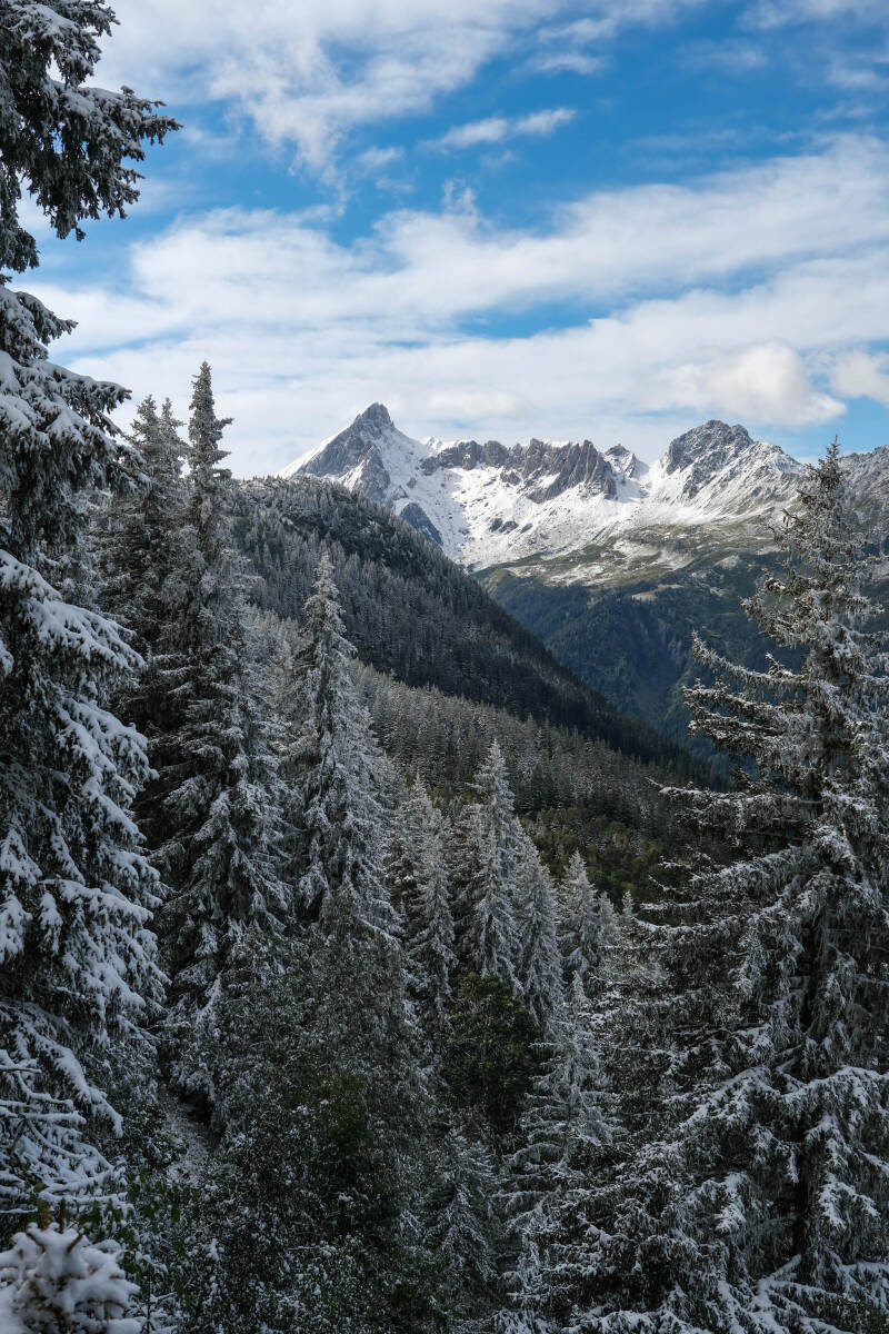 On relie la Combe d'Armancette au Refuge de Tré la Tête par le Sentier Claudius Bernard. La neige et le givre rendent cette traversée toute particulière avec ce mélange de vert et de blanc. Au niveau du refuge, on descend reprendre le TMB classique plus bas dans la vallée avant de partir à l'assaut de notre premier col : le Col du Bonhomme.