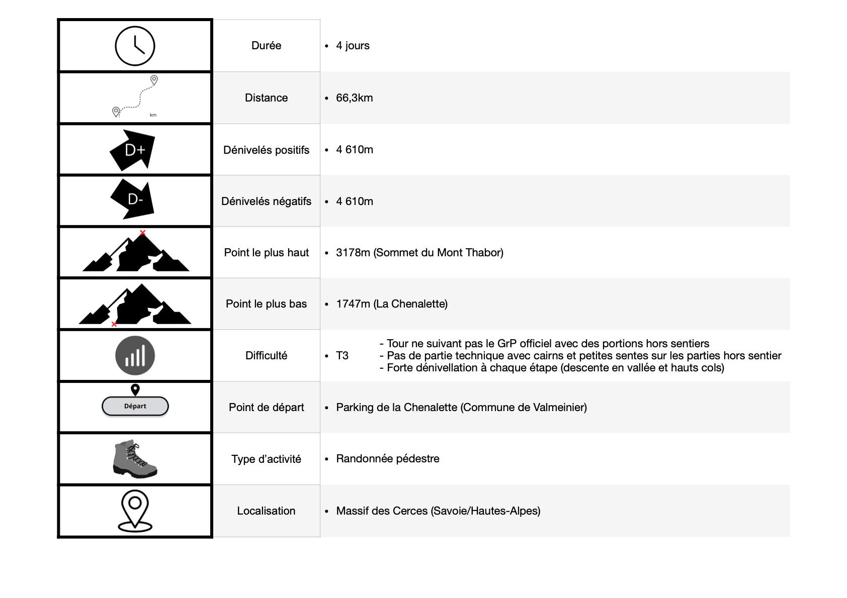 Comme à notre habitude, on ne se contentera pas de suivre à la lettre l'itinéraire du GrP du Tour du Mont Thabor. On essayera d'inclure des portions plus alpines, plus discrètes et bien entendu on ne se cantonnera pas au tour puisque l'ascension du Mont Thabor fera partie de l'aventure.