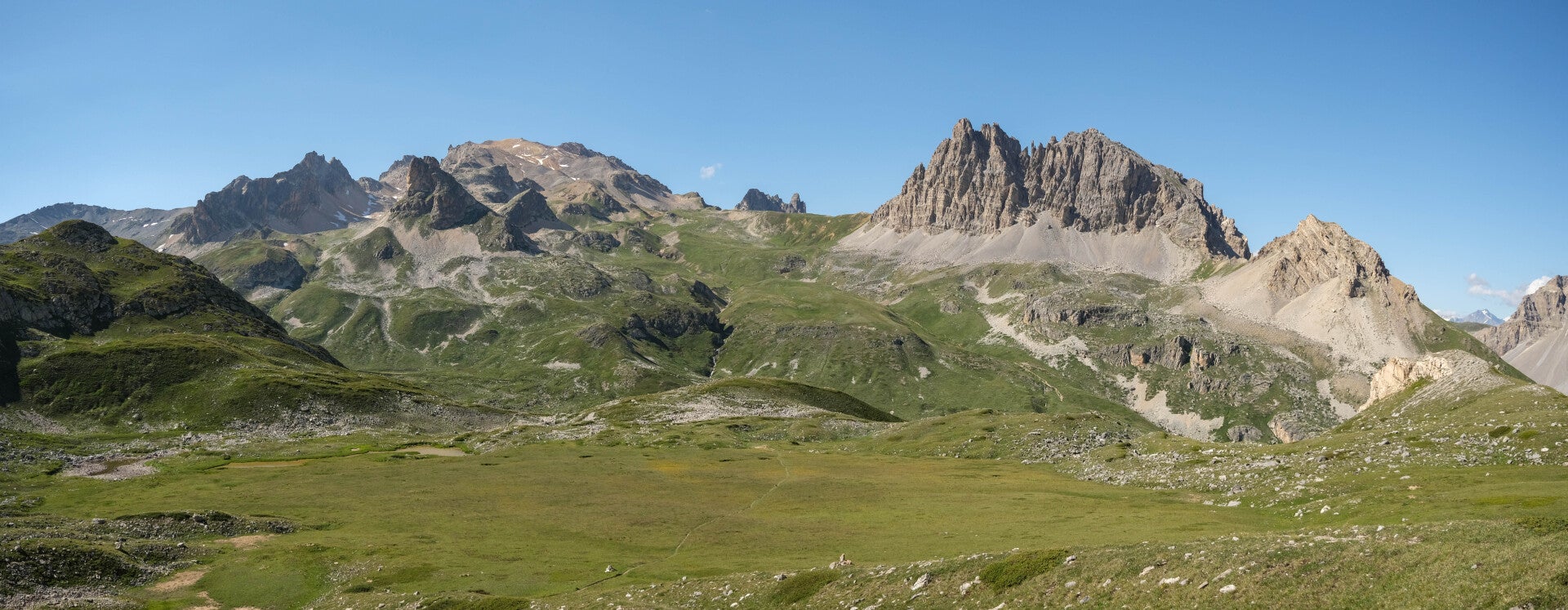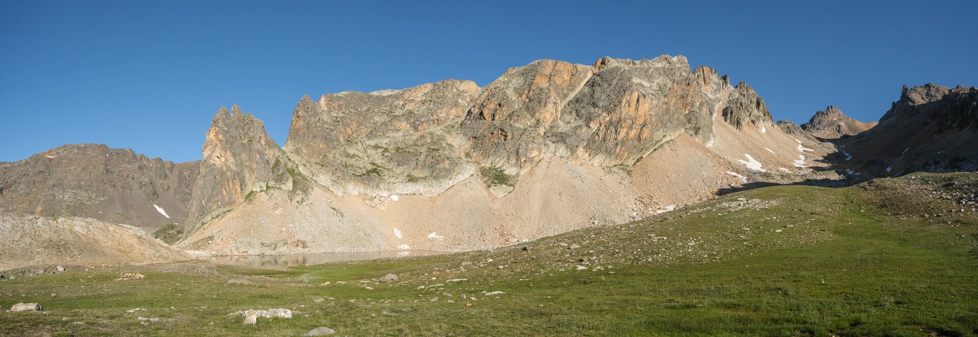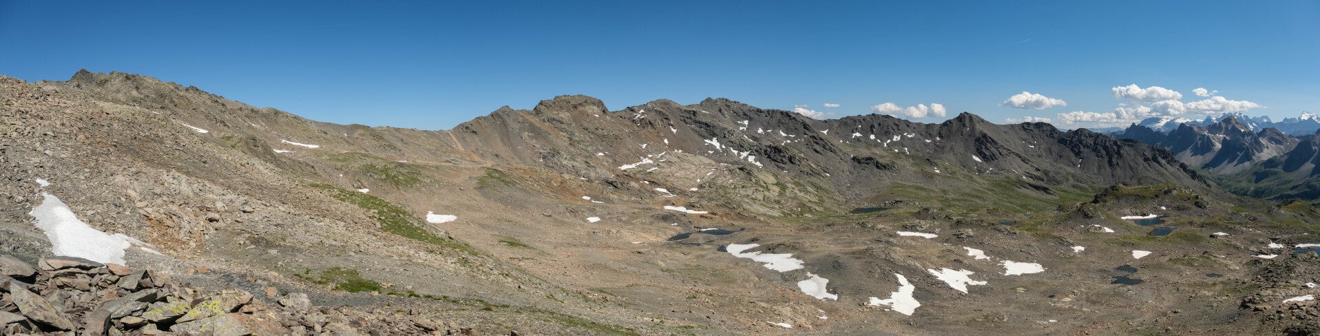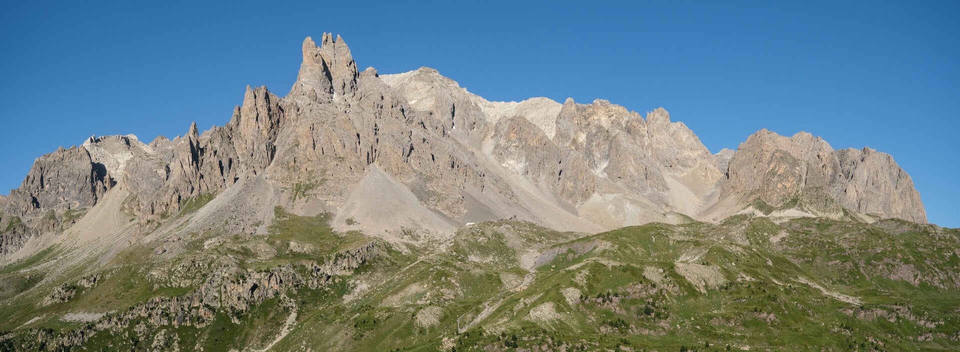 Panorama depuis le Lac Curtalès (de gauche à droite) : la Pointe de Terre Rouge, le Pic du Thabor, le Mont Thabor, la Pointe des Angelières, le Roc de Valmeinier, la Roche du Chardonnet et notre objectif du jour, le Col de Névache.