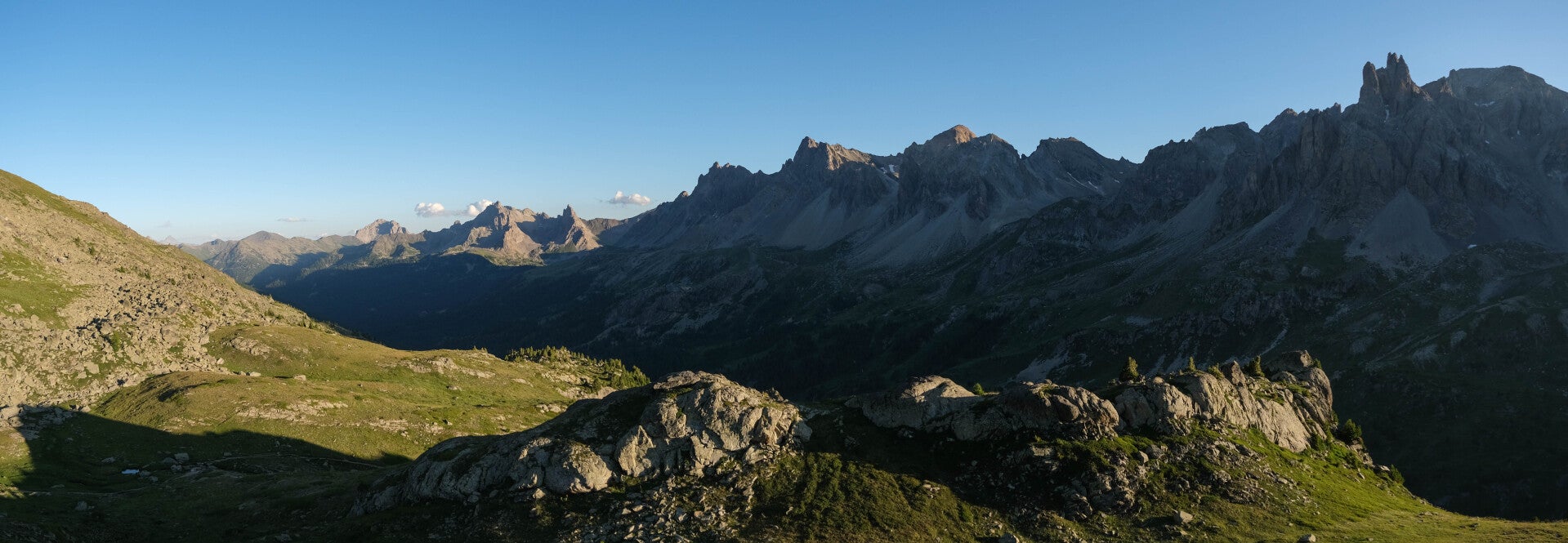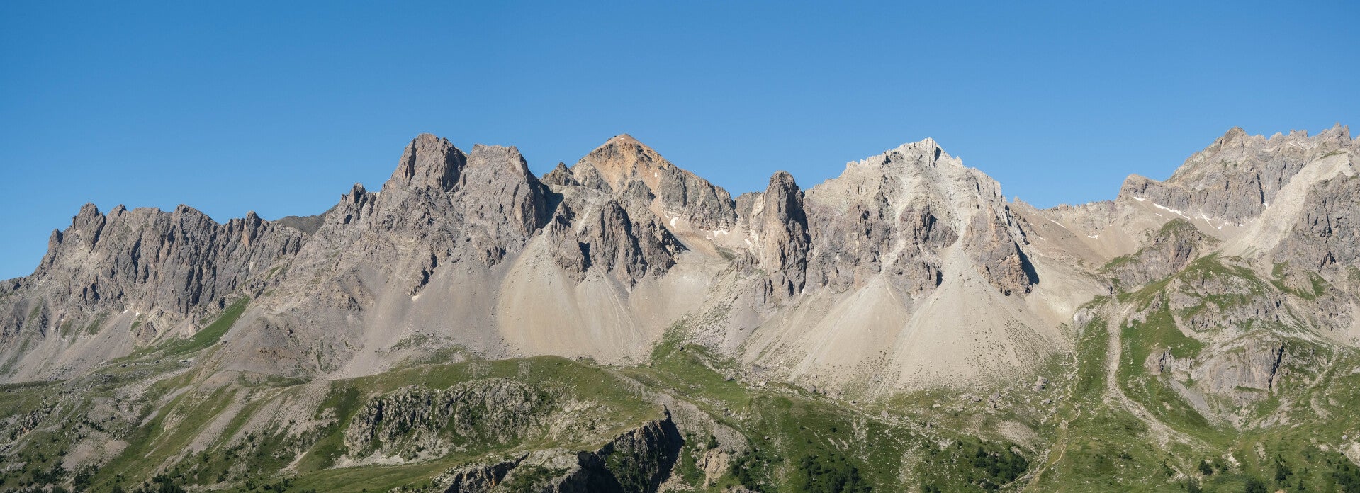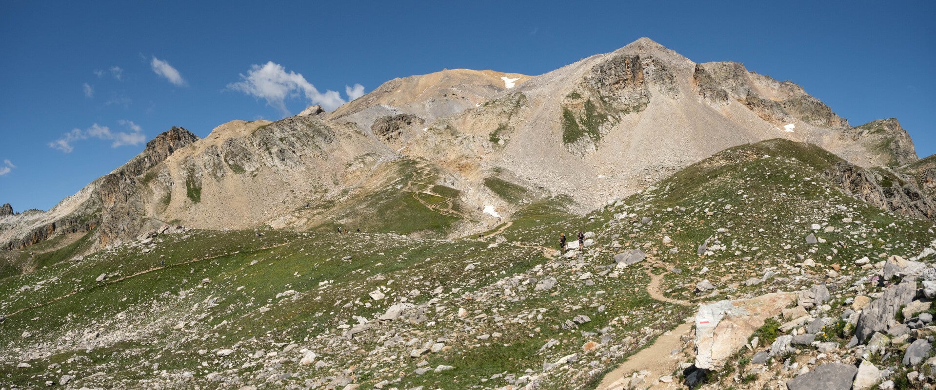 Panorama depuis le Lac Curtalès (de gauche à droite) : la Pointe de Terre Rouge, le Pic du Thabor, le Mont Thabor, la Pointe des Angelières, le Roc de Valmeinier, la Roche du Chardonnet et notre objectif du jour, le Col de Névache.