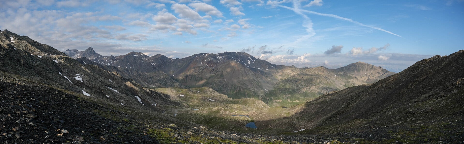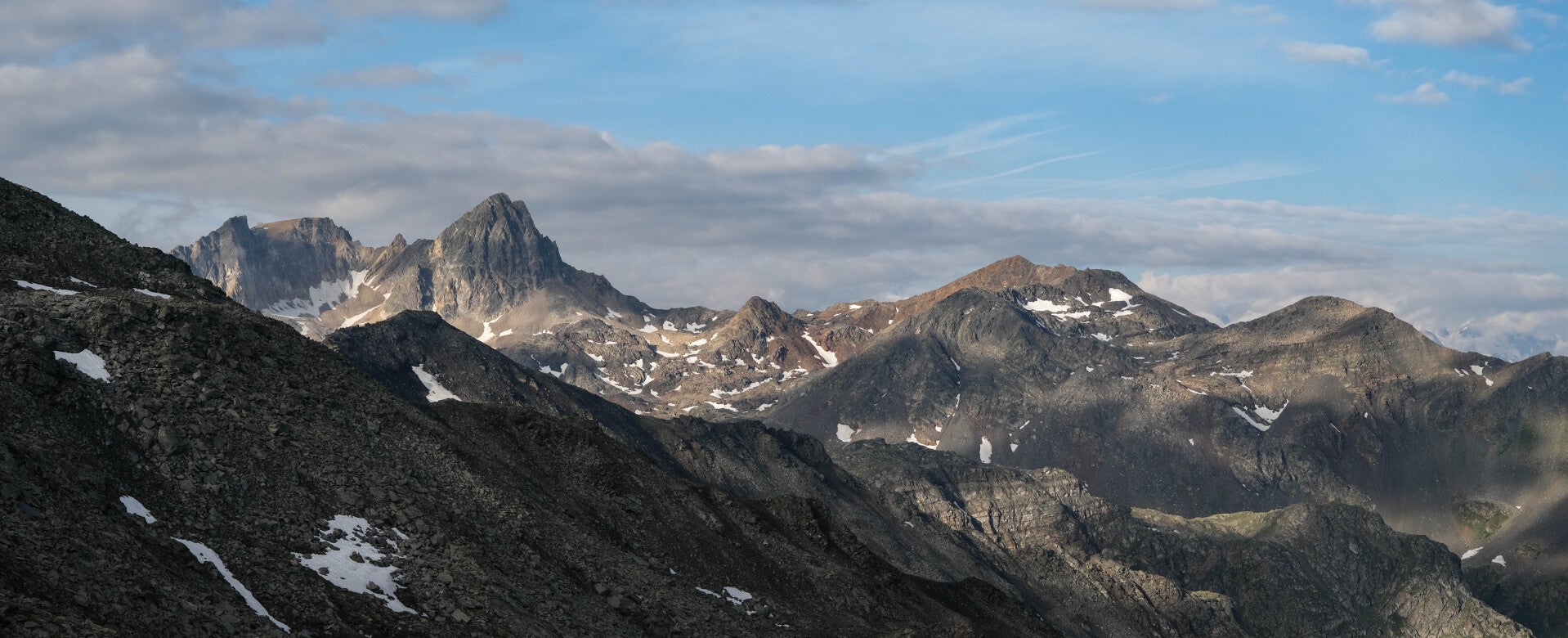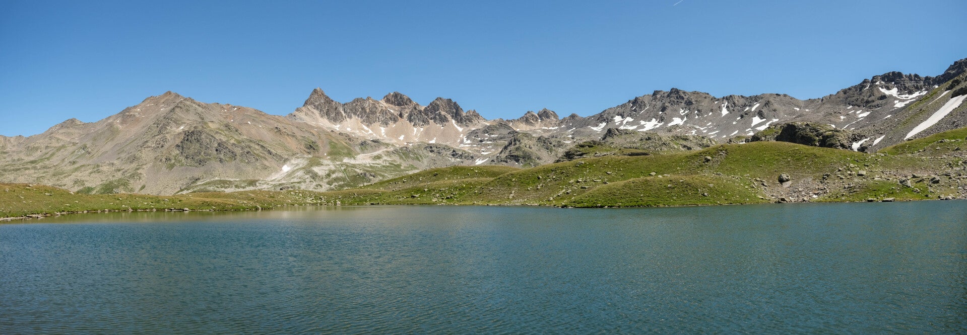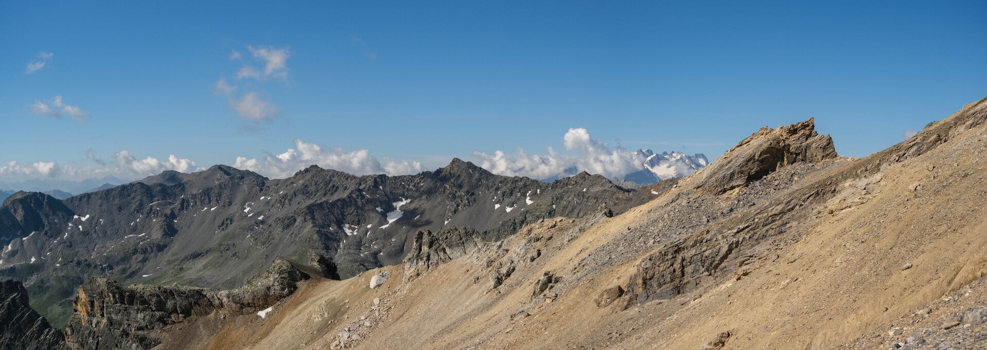 Panorama depuis le Lac Curtalès (de gauche à droite) : la Pointe de Terre Rouge, le Pic du Thabor, le Mont Thabor, la Pointe des Angelières, le Roc de Valmeinier, la Roche du Chardonnet et notre objectif du jour, le Col de Névache.