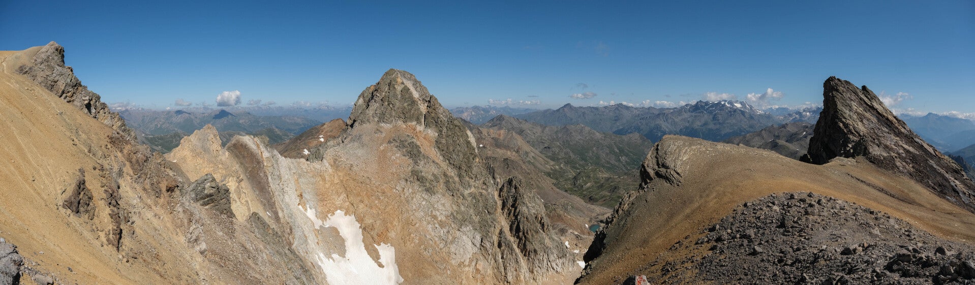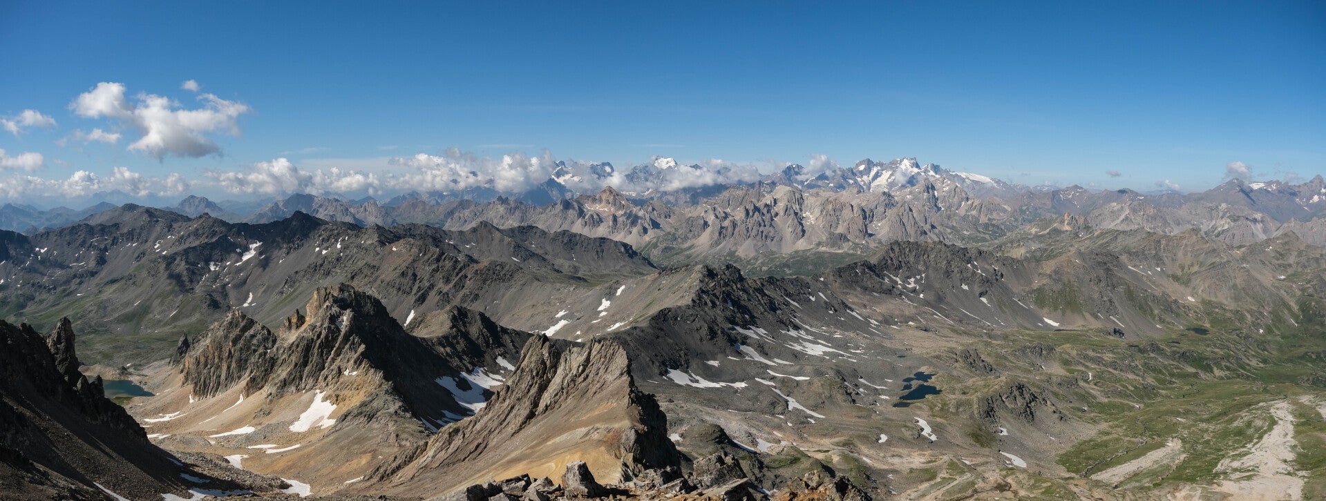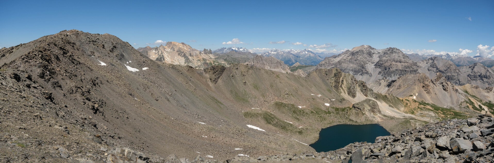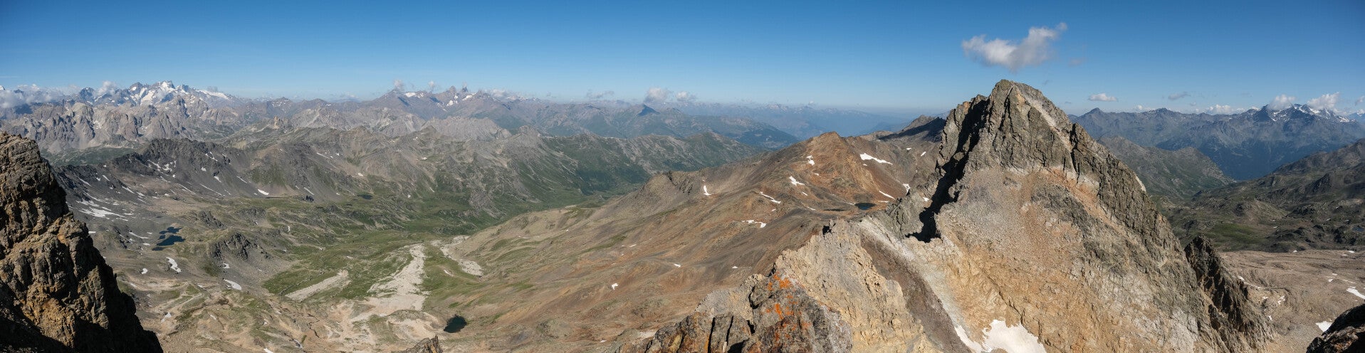Depuis le Pic du Lac Blanc 2980m, un panorama à 360° s'offre à nous. Presque tout y passe : Queyras, Alpes italiennes, Mont-Cenis, Alpes Grées, Vanoise et ses glaciers, Mont Thabor, Aiguilles d'Arves et du Goléon, Massif des Ecrins sans oublier la Clarée. Manque les deux géants que sont le Mont Blanc, caché par la Vanoise, et le Mont Viso, caché par la nebbia.
