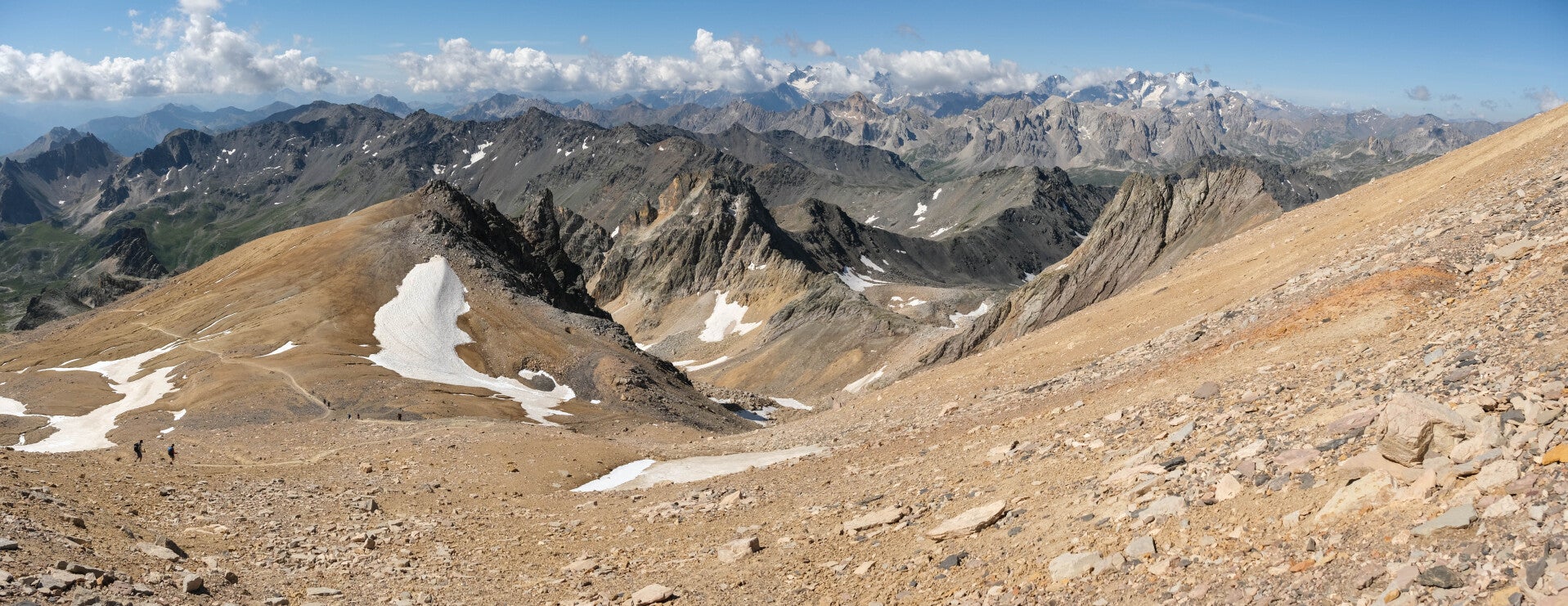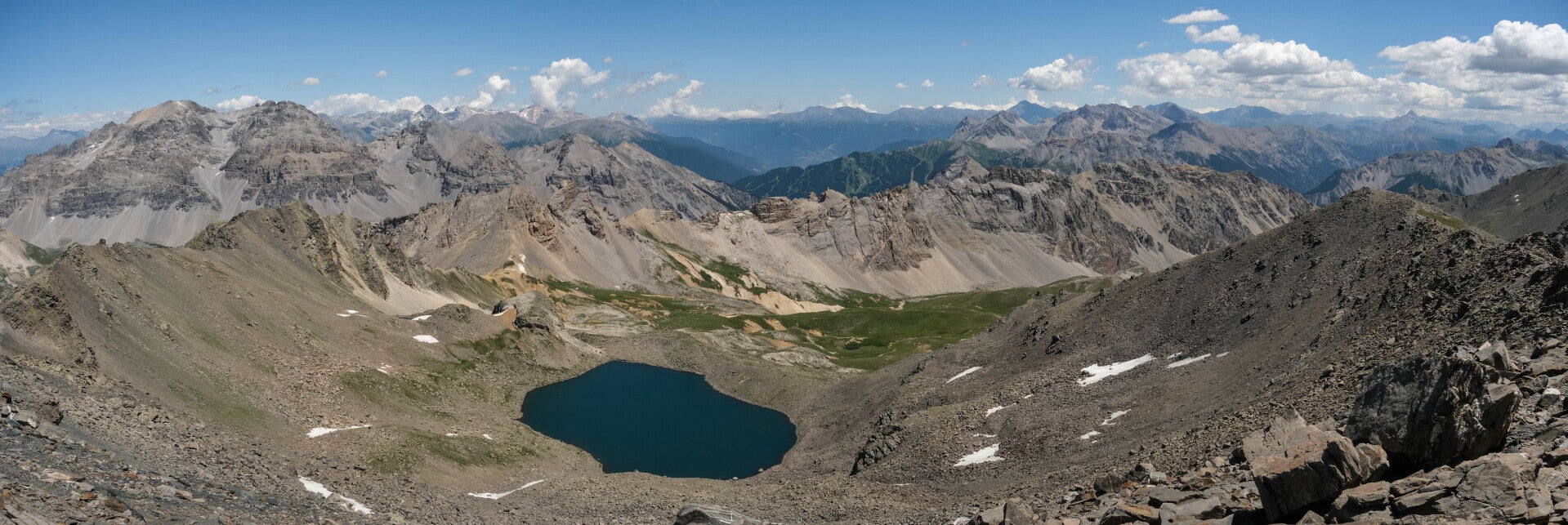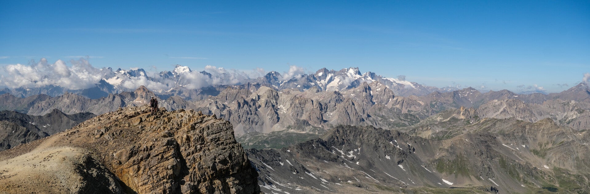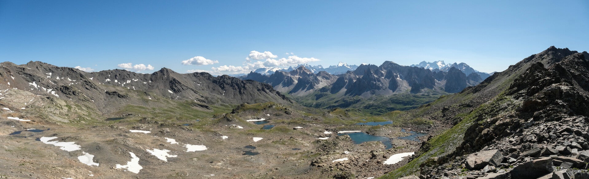 Depuis le Pic du Lac Blanc 2980m, un panorama à 360° s'offre à nous. Presque tout y passe : Queyras, Alpes italiennes, Mont-Cenis, Alpes Grées, Vanoise et ses glaciers, Mont Thabor, Aiguilles d'Arves et du Goléon, Massif des Ecrins sans oublier la Clarée. Manque les deux géants que sont le Mont Blanc, caché par la Vanoise, et le Mont Viso, caché par la nebbia.