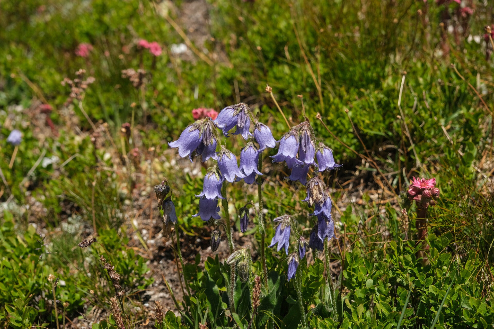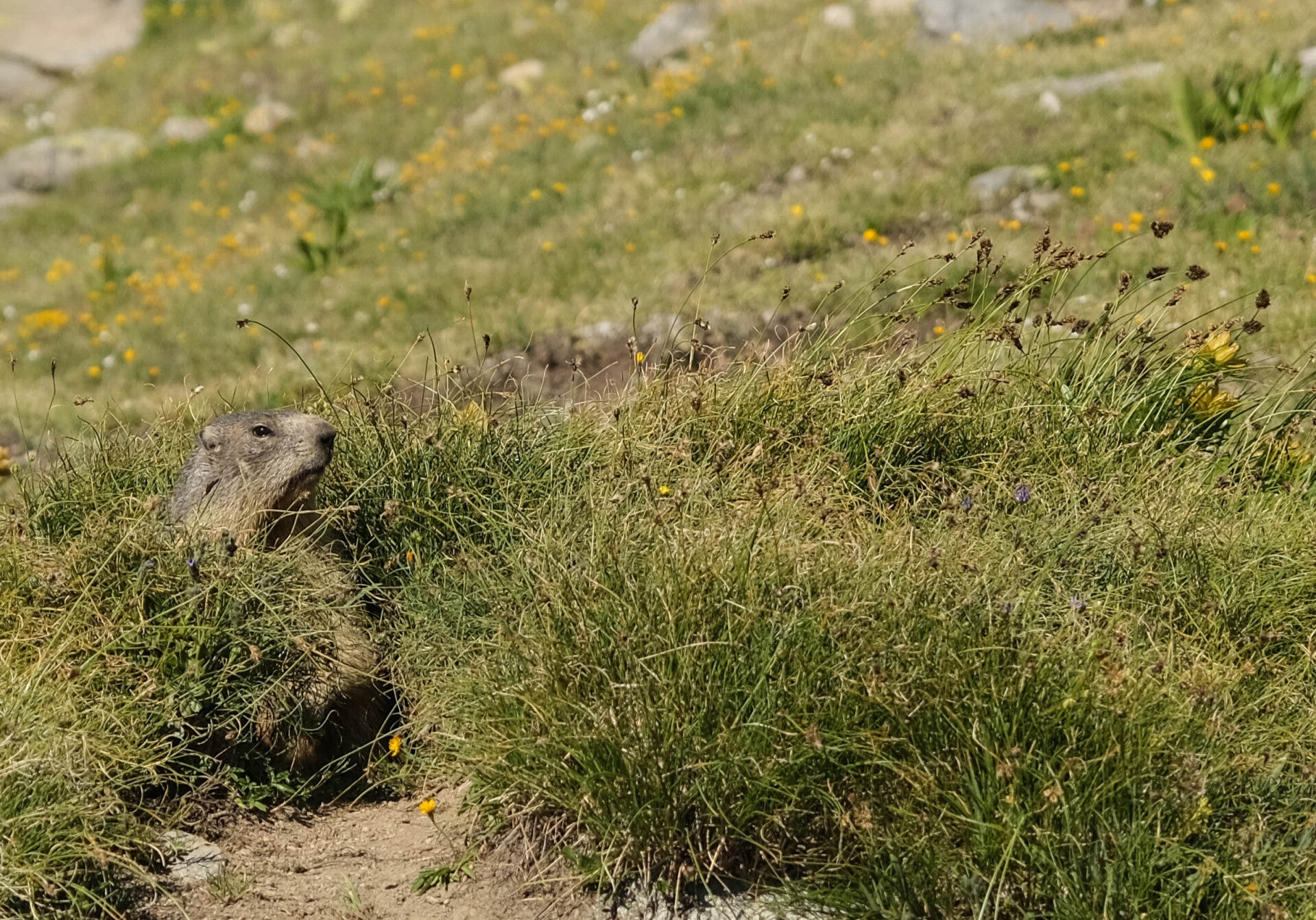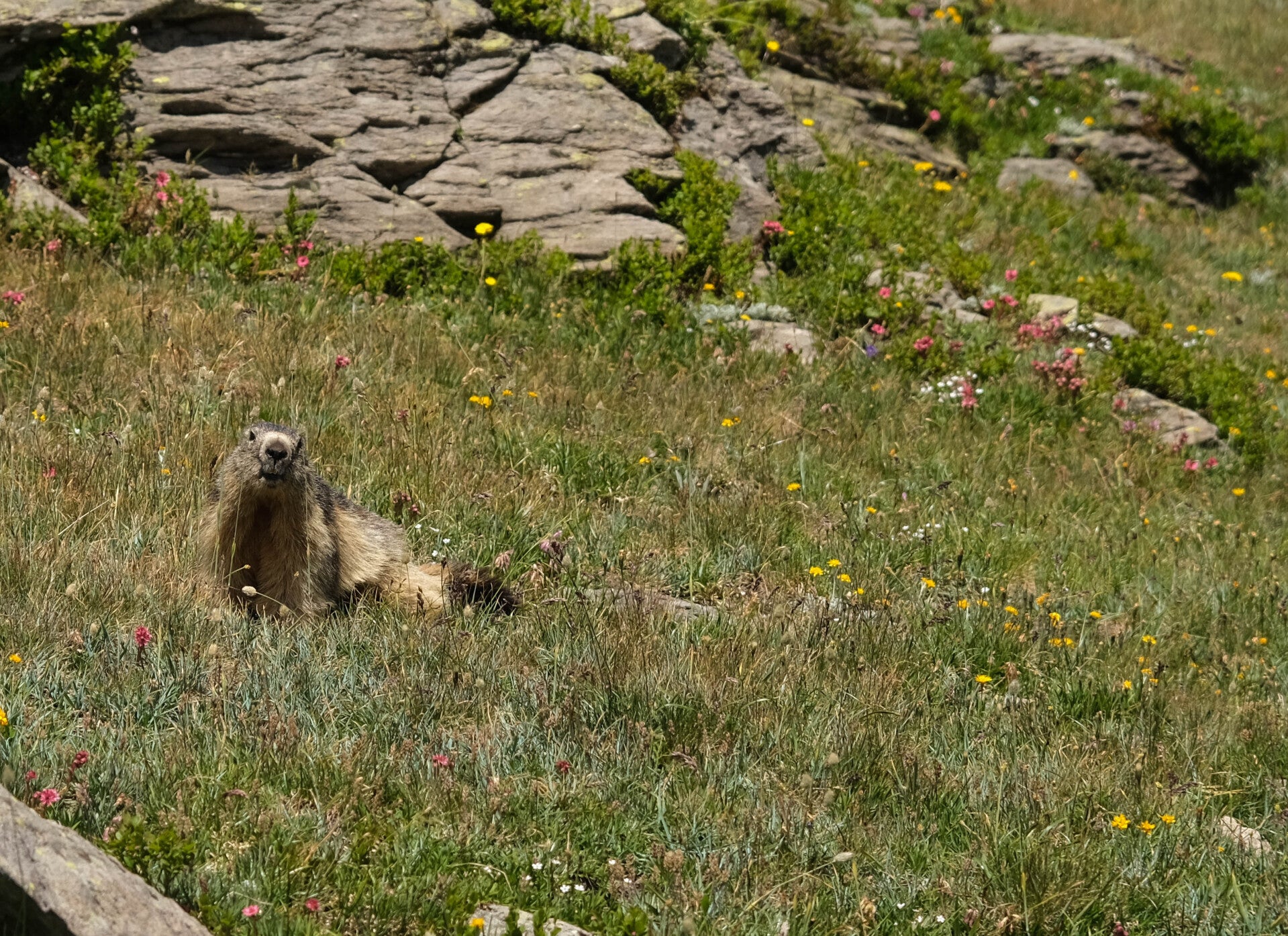 La traversée entre le Lac du Peyron et le Refuge du Mont Thabor est assez longue et on reste pendant quelques kilomètres aux alentours des 2400m d'altitude. On profite de cette traversée en balcon au-dessus de la Vallée Etroite pour observer la faune et la flore locale à l'instar de cette marmotte curieuse et de ces bouquets de Campanules Barbues.