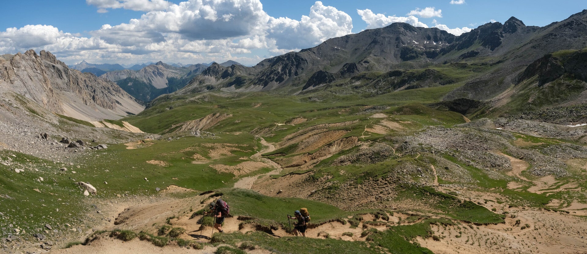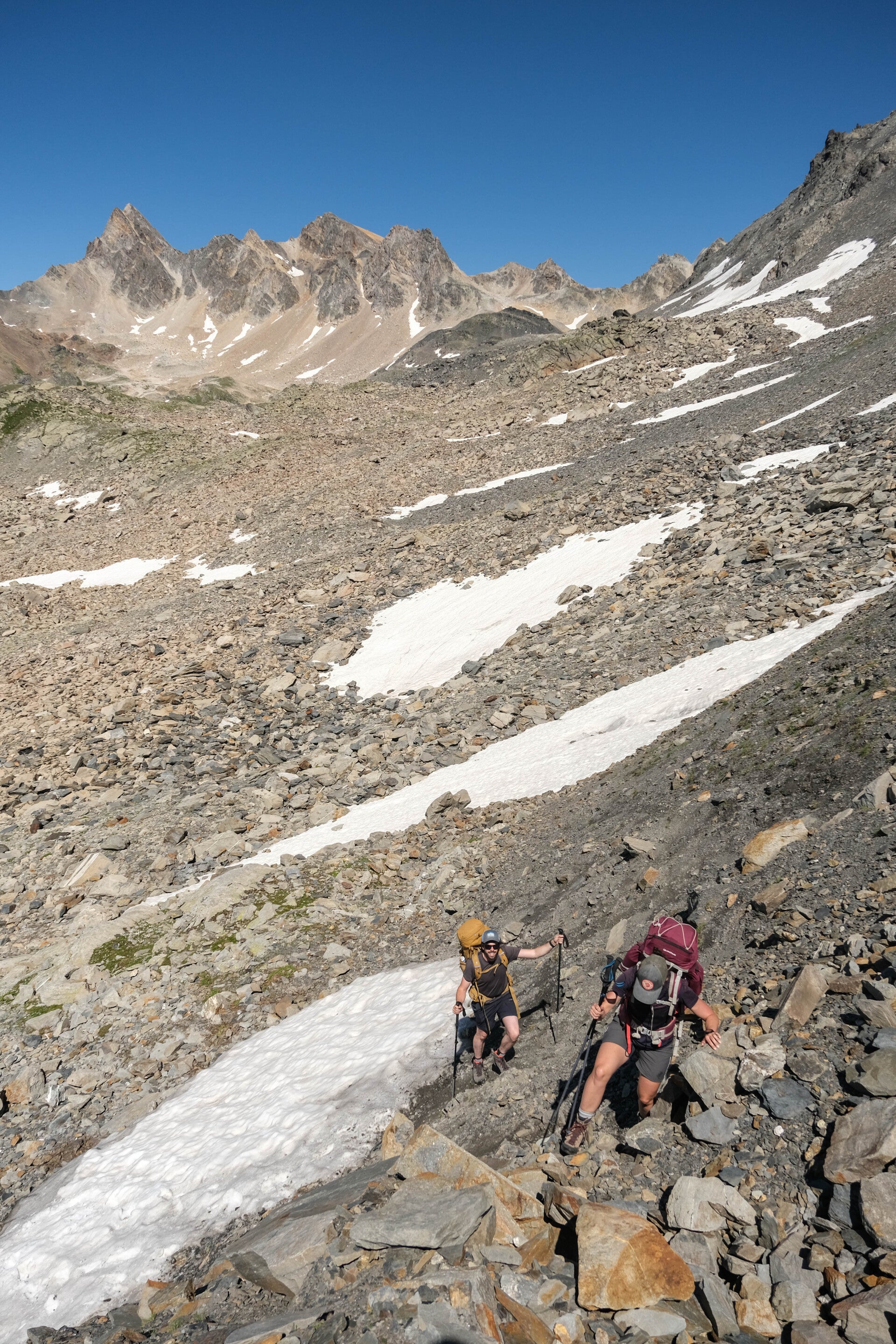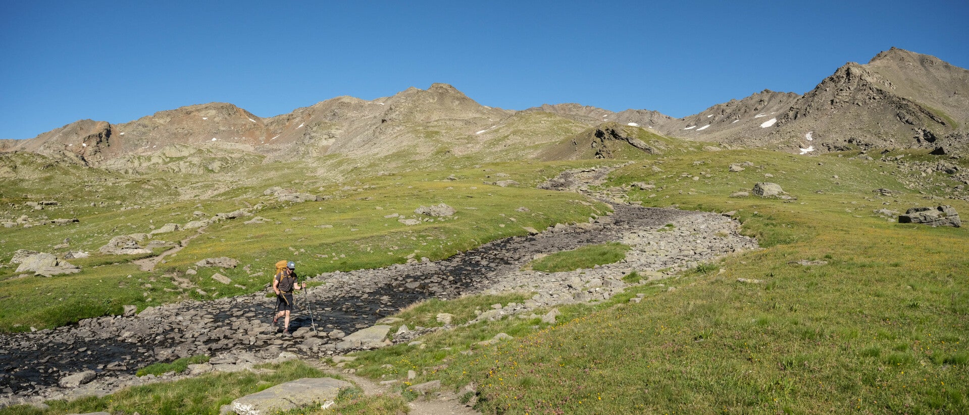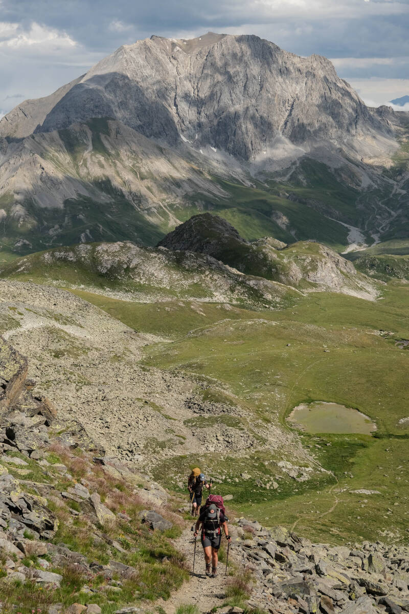 Au réveil, l'ambiance est plus mitigée que les jours précédents. L'humidité et la nébulosité sont de la partie et d'autres orages sont prévus en cours d'après-midi. On se met donc rapidement en route pour franchir les deux hauts cols de la journée. Le premier étant assez proche de notre bivouac, il sera rapidement franchi afin que nous basculions sur le Vallon de Bissorte.