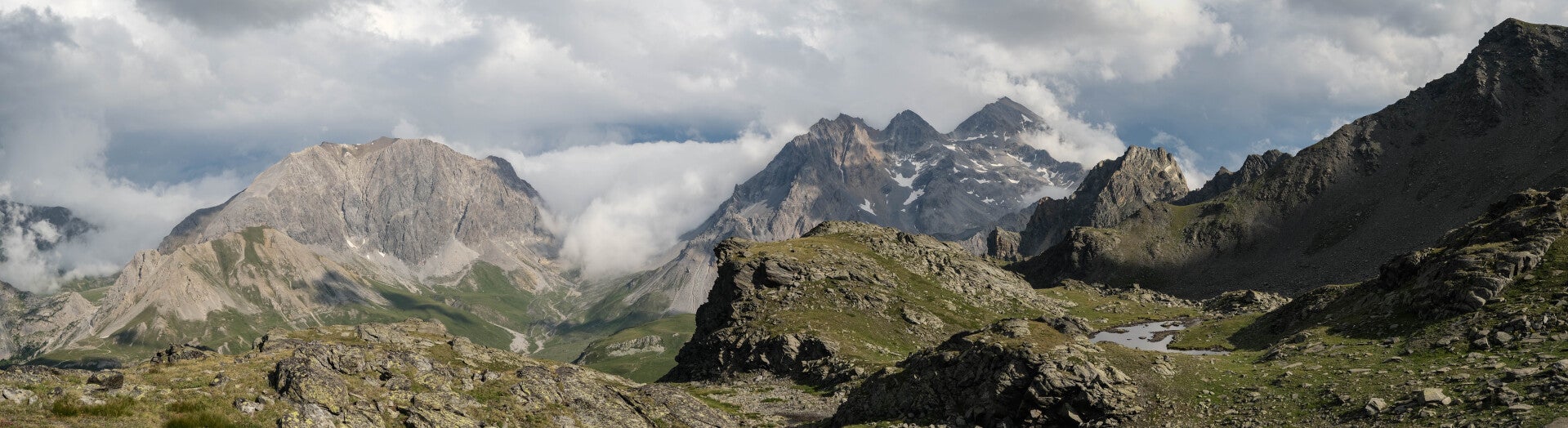 En progressant en altitude, la nébulosité prend de l'ampleur sur la zone frontalière, notamment au-dessus du Grand Argentier 3042m, du Col de la Roue, de la Cime de la Planette 3104m et de la Roche Bernaude 3226m, les principaux sommets dans notre dos.