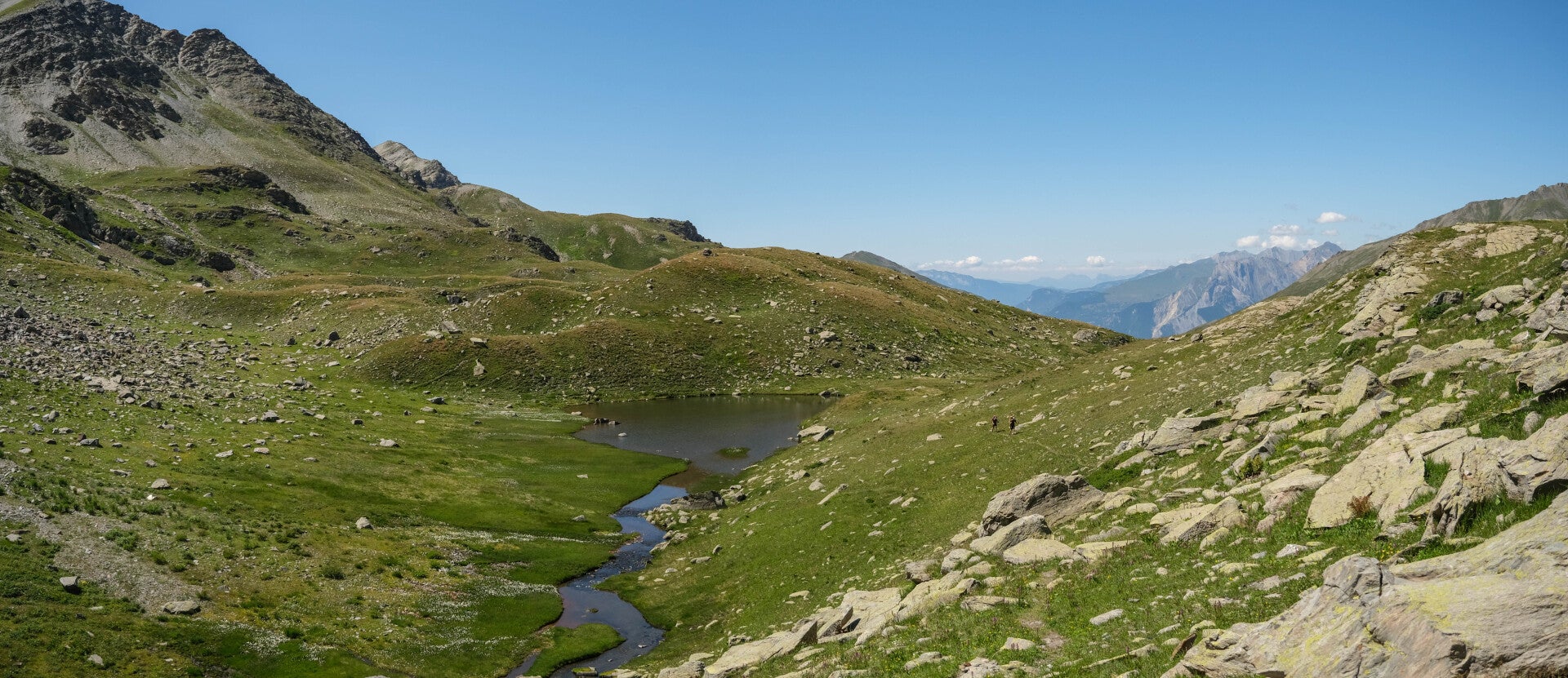 On bascule donc de la Savoie aux Hautes-Alpes, de la Vallée de la Neuvache à la Vallée de la Clarée. Le versant haut-alpin est un peu moins abrupt que le savoyard. On descend tranquillement jusqu'à la périphérie des Lacs de la Madeleine que l'on devine ci-contre. A vue, on partira rejoindre le Gr57 du Tour des Cerces qui se cache au milieu de ce paysage, entre le Col et le Lac des Muandes.