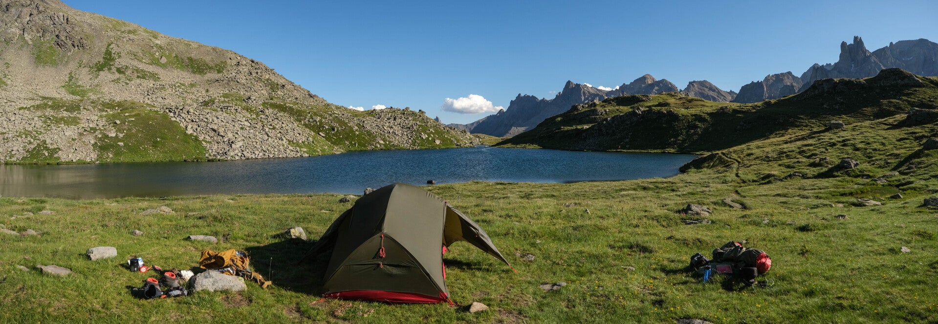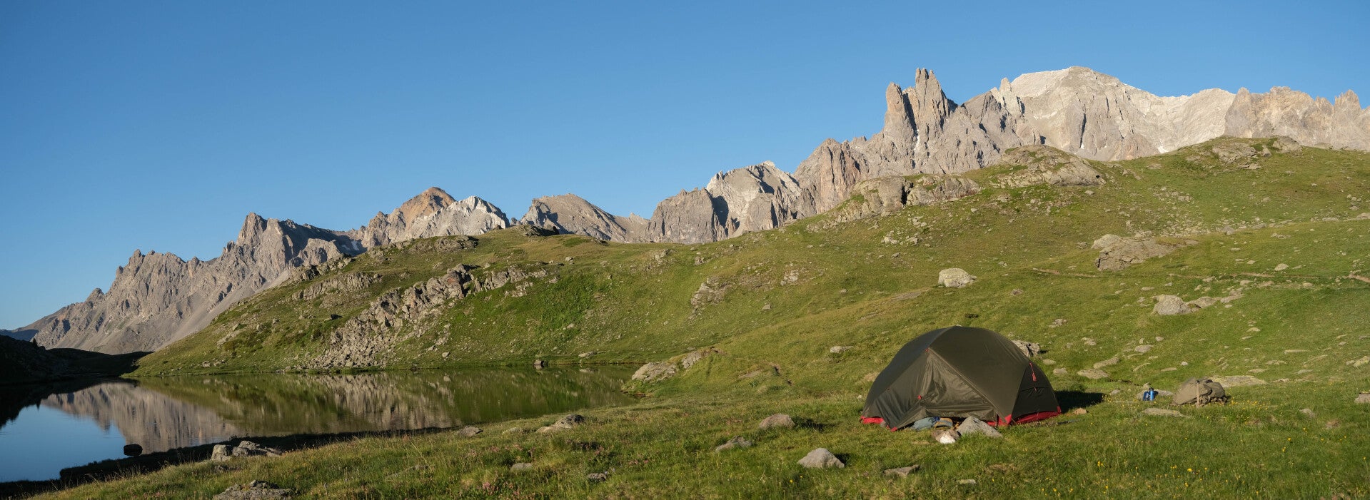 Alors que le soleil débute sa lente et inexorable chute, on atteint le Lac Long 2387m où on décide d'installer notre bivouac. En face, la Tête de la Cassille, la Main de Crépin et la Pointe des Cerces comblent l'arrière-plan de ce paysage de carte postale.