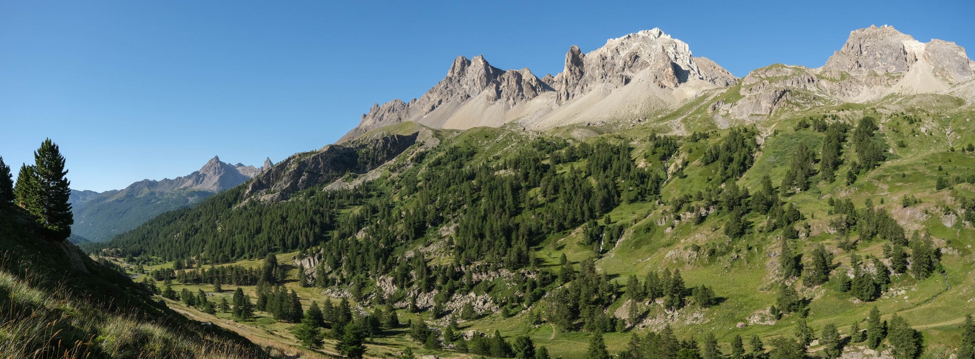 Malgré le fait que nous chutions d'environ 400m vers le fond de vallée, le paysage reste splendide avec un mélézin clairsemé qui se termine dans un dédale de pierriers et de parois verticales. Ajoutons à cela les nombreux lacs qui se cachent dans ces montagnes et on comprend vite l'engouement actuel sur ce petit bout des Alpes, aux confins du territoire français.