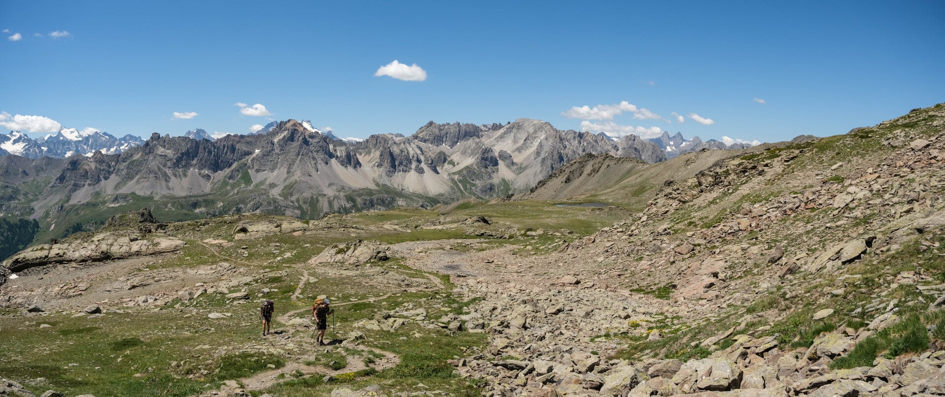 Au Col de Névache 2794m, la vue se dégage sur le versant haut-alpin avec notamment la Pointe des Cerces et les hautes cimes des Ecrins en guise de récompense.