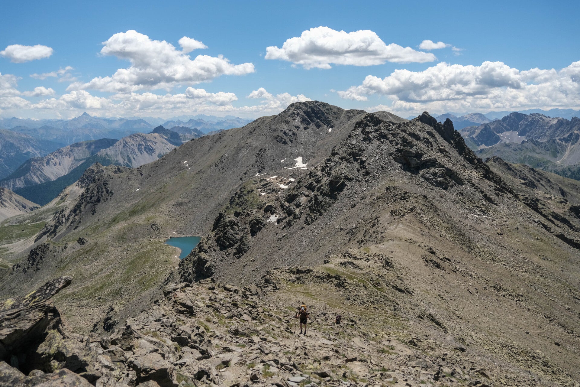 Au Col du Grand Cros 2848m, bien que l'on domine une nouvelle vallée à l'Est, on reste sur le bassin de la Clarée. On continue maintenant sur le fil de l'arête qui n'est en rien vertigineuse mais au contraire bien large. Un nouveau lac apparait dans un creux de la montagne : le Lac Long (encore un !) alors qu'au loin les Massifs du Queyras, des Alpes Cottiennes et du Mont-Cenis sont de la partie. On reconnait d'ailleurs la cime pyramidale du Pic de Rochebrune 3320m, point culminant du Queyras.