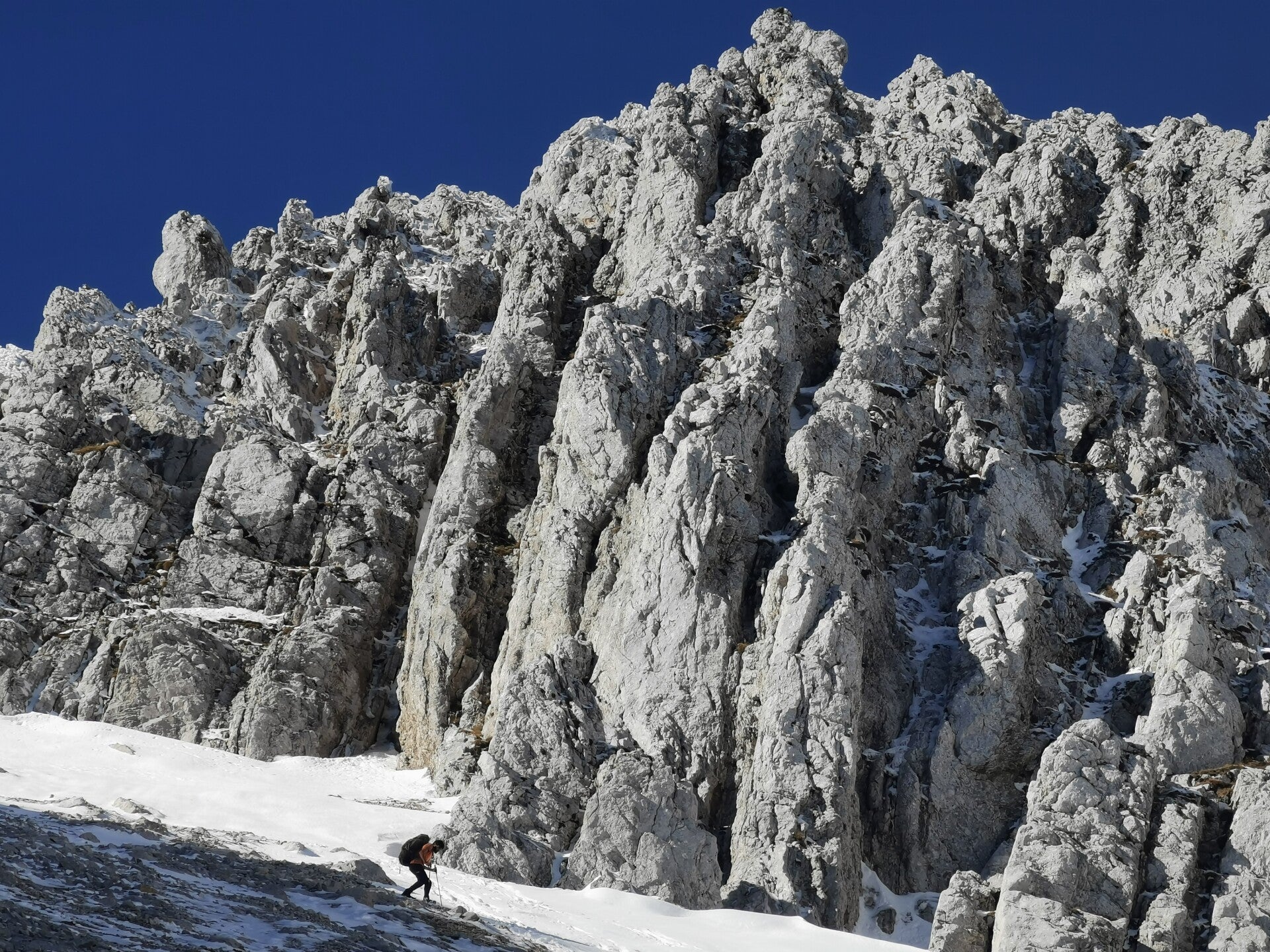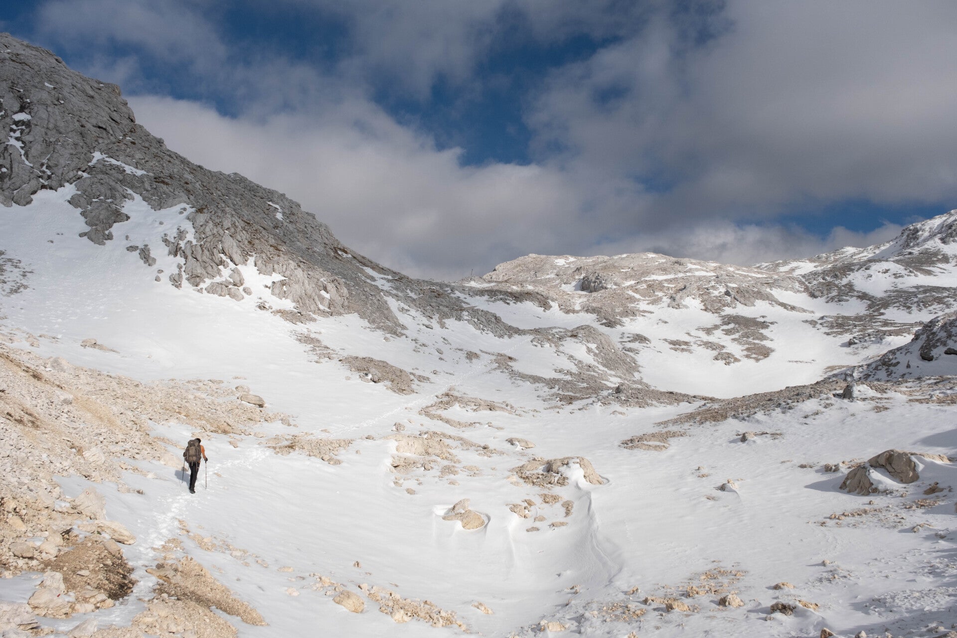 Cette traversée du Massif des Karavanke s'avérera plus difficile que prévue. Les plaques de neige ont gelé pendant la nuit au point où s'enfoncer, même un tout petit peu, est impossible. Au contraire, nous glissons. Heureusement, la pente n'est pas abrupte mais cela empêche également de pouvoir taper facilement sur la neige pour y planter nos pieds et avancer plus facilement. Nous mettrons beaucoup plus de temps que prévu, ce qui nous conduira à réduire l'étape du jour.