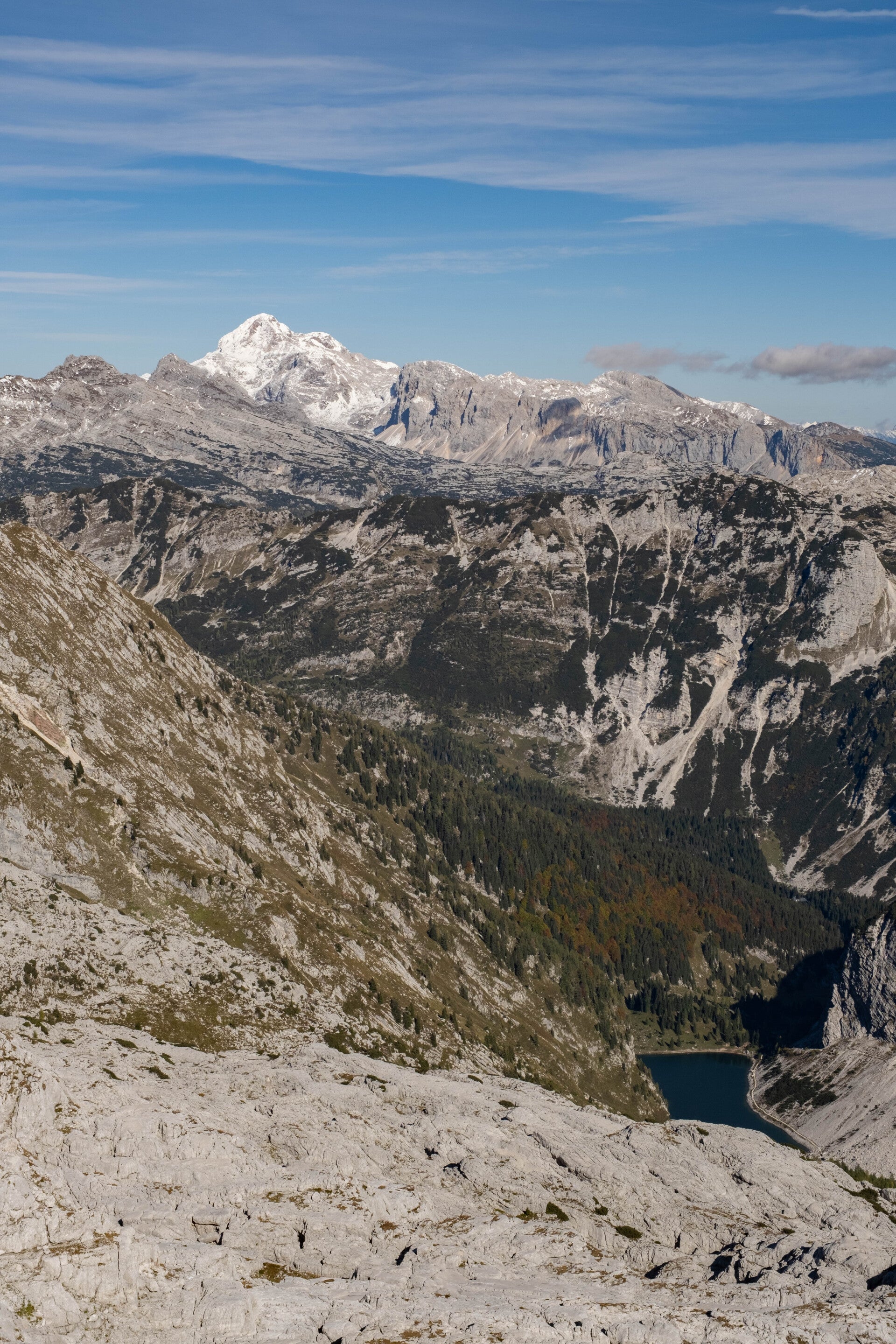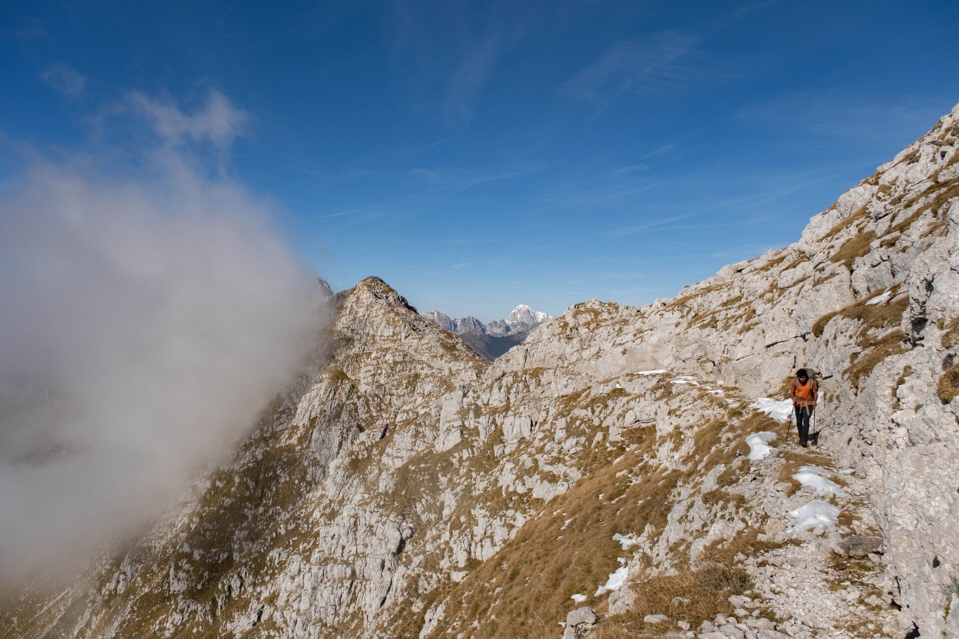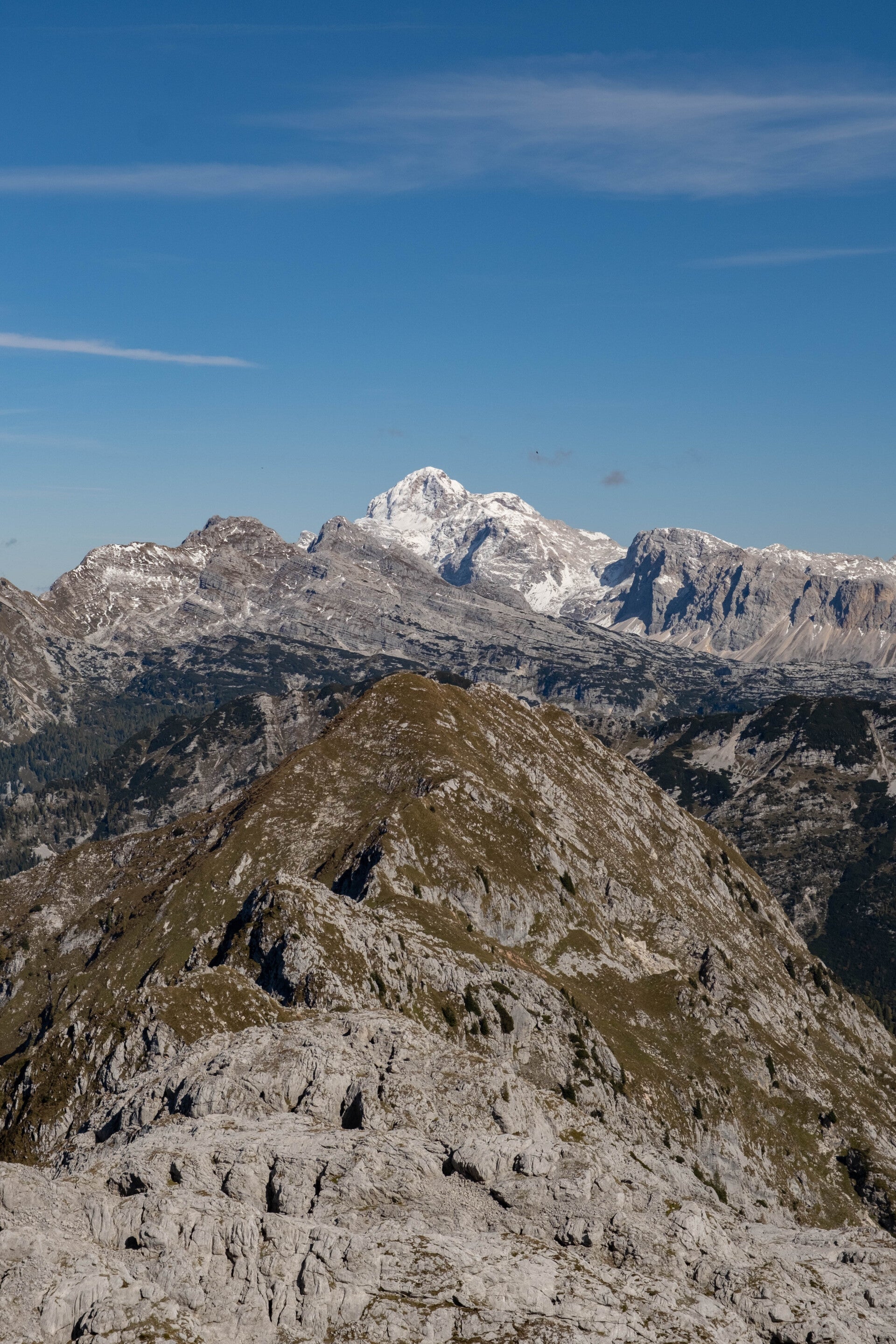 Les vautours fauves nous offrent un bal de haute voltige lors de notre traversée des arêtes du Krn. Tout au fond, ce sont bien les Dolomites italiennes que l'on aperçoit. On peut par exemple reconnaitre le sommet enneigé du Monte Pelmo au centre gauche ou la pointe massive de l'Antelao au centre droit.