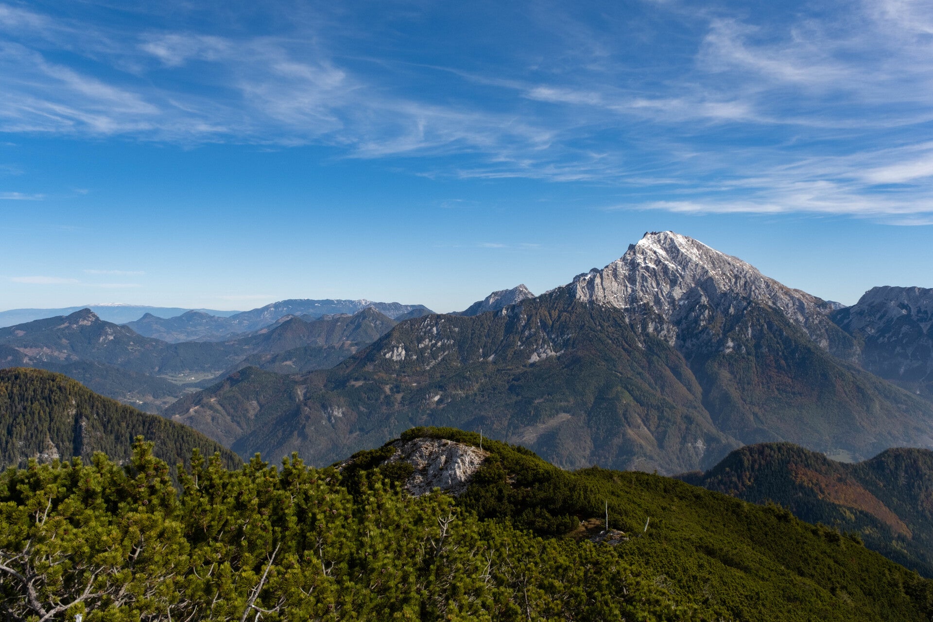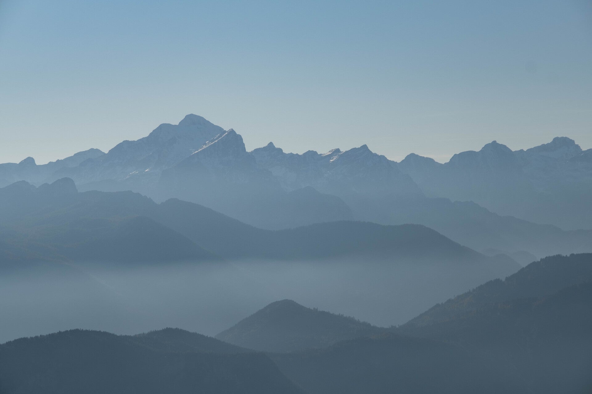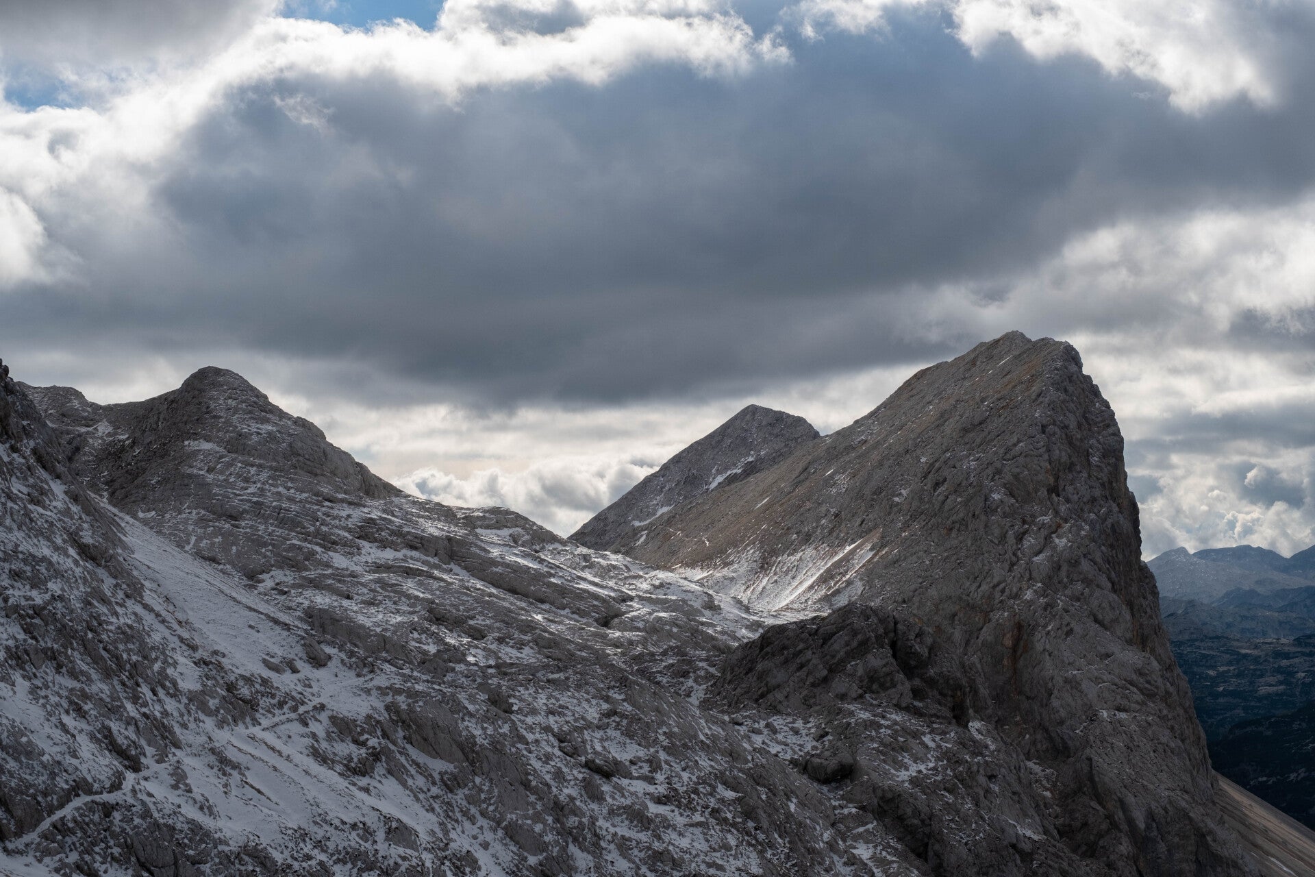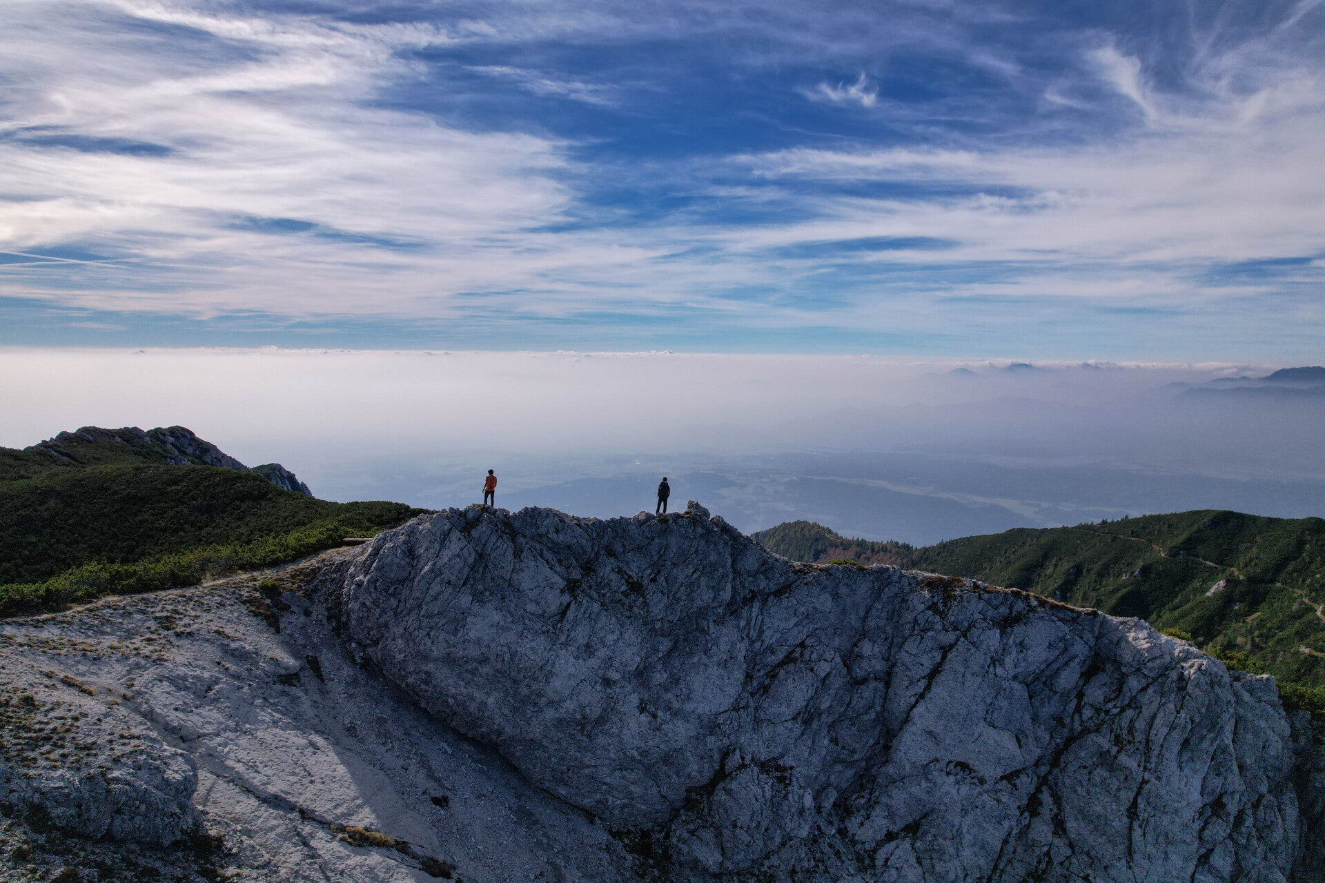 Nous traversons le flanc Sud des montagnes et notamment le Storžič 2132m avant de gravir deux petits sommets : le Basel Jski Vrh 1744m et le Mali Grintavec 1813m. De ces deux sommets, la vue est imprenable sur la brume slovène et les Alpes Kamniques.