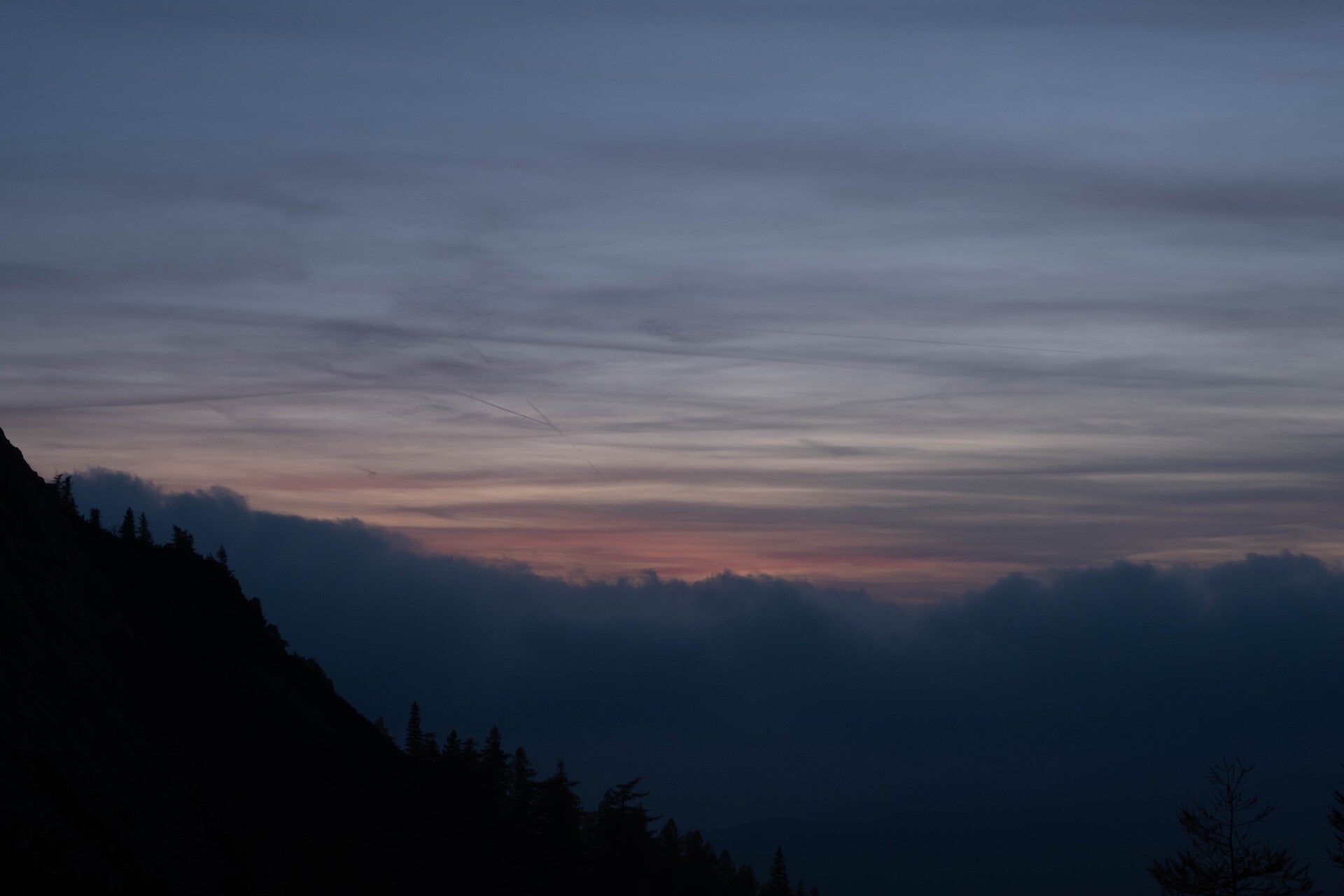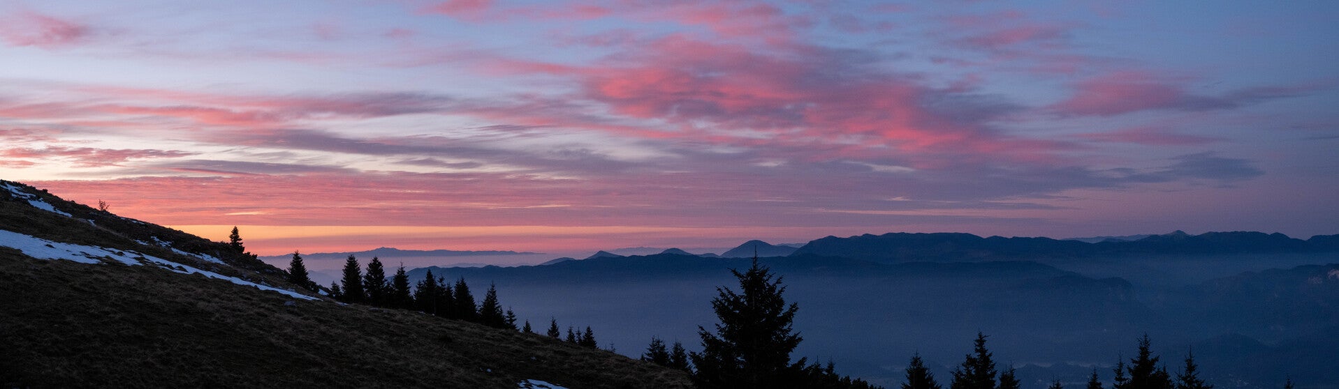 Au matin, la mer de nuages a disparu. Quelques bancs de nuages élevés se déplacent haut dans le ciel. C'est une autre belle journée qui s'annonce pour la traversée du Massif des Karavanke. Et le lever du soleil nous fera rapidement sortir de la tente, tant les couleurs seront resplendissantes dans le ciel.
